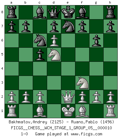 Last move : 1-0 2012 February 12 7:22:28 [Event "FICGS__CHESS__WCH_STAGE_1_GROUP_05__000010"] [Site "FICGS"] [Date "2012.01.01"] [Round "1"] [White "Bakhmatov,Andrey"] [Black "Ruano,Pablo"] [Result "1-0"] [WhiteElo "2125"] [BlackElo "1496"] 1.e4 c5 2.Nf3 e6 3.d4 Nc6 4.d5 exd5 5.exd5 Nce7 6.d6 Nc6 7.Qe2+ Nge7 8.Nc3 g6 9.Nd5 1-0 This chess game has been lost on time (started : 2012.01.01 23:15:22) Sicilian defense Player White won this chess game. Follow this game move after move (download)Those who say they understand Chess, understand nothing. (Robert Hubner) Das ganze Leben mit einer Ehefrau ist wie ein Endspiel mit ungleichfarbigen Läufern. (Viktor Kortschnoi) El Jaque al descubierto es el bombardero del tablero. (Reuben Fine) On est toujours la mazette de quelqu'un d'autre. (Anonyme) Is not life a hundred times too short to bore ourselves ? (Friedrich Nietzsche)