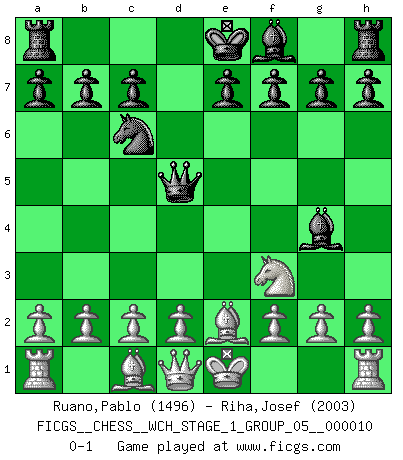 Last move : 0-1 2012 February 7 12:12:29 [Event "FICGS__CHESS__WCH_STAGE_1_GROUP_05__000010"] [Site "FICGS"] [Date "2012.01.01"] [Round "1"] [White "Ruano,Pablo"] [Black "Riha,Josef"] [Result "0-1"] [WhiteElo "1496"] [BlackElo "2003"] 1.e4 d5 2.exd5 Nf6 3.Nc3 Nxd5 4.Nxd5 Qxd5 5.Nf3 Bg4 6.Be2 Nc6 0-1 Scandinavian defense Player Black won this chess game. Follow this game move after move (download)First-class players lose to second class players because second-class players sometimes play a first-class game. (Tarrasch) Ich bin Weltmeister und muß mit niemandem irgend etwas diskutieren. (Viswanathan Anand) Ciertamente, de todas la drogas del mundo, el Ajedrez debe ser el mas placentero permamentemente. (Assiac) Un journaliste : 'Vous préférez avoir une dame de plus sur l'échiquier ou au lit ?' Boris Spassky : 'Ca dépend de la position.' The modern world has divided itself into Conservatives and Progressives. The business of Progressives is to go on making mistakes. The business of the Conservatives is to prevent the mistakes from being corrected. (G.K. Chesterton)