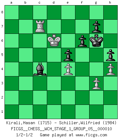 Last move : 1/2-1/2 2012 May 6 15:41:37 [Event "FICGS__CHESS__WCH_STAGE_1_GROUP_05__000010"] [Site "FICGS"] [Date "2012.01.01"] [Round "1"] [White "Kirali,Hasan"] [Black "Schiller,Wilfried"] [Result "1/2-1/2"] [WhiteElo "1715"] [BlackElo "1984"] 1.e4 c5 2.Nf3 Nc6 3.d4 cxd4 4.Nxd4 Nf6 5.Nc3 e5 6.Ndb5 d6 7.Bg5 a6 8.Na3 b5 9.Nd5 Be7 10.Bxf6 Bxf6 11.c3 O-O 12.Nc2 Bg5 13.a4 bxa4 14.Rxa4 a5 15.Bc4 Rb8 16.h4 Bh6 17.b3 Ne7 18.Nxe7+ Qxe7 19.Rxa5 Qc7 20.Ra1 Rxb3 21.Bxb3 Qxc3+ 22.Kf1 Qxb3 23.Ne3 Qxd1+ 24.Rxd1 Bxe3 25.fxe3 Bb7 26.Rxd6 h5 27.Kf2 Ra8 28.Rhd1 Bxe4 29.Rd8+ Rxd8 30.Rxd8+ Kh7 31.Rd6 f6 32.Ra6 Kg6 33.Ra7 Bd5 34.g3 Bc6 35.Rc7 Bd5 36.Ke2 Bg2 37.Kd3 Bf1+ 38.Kc3 Bg2 39.Ra7 Kh6 40.Ra2 Be4 41.Kc4 Kg6 42.Ra7 Bf3 43.Kd3 Bd5 44.e4 Be6 45.Kc3 Bh3 46.Kc4 Be6+ 47.Kc5 Bg8 48.Kd6 Bc4 49.Rc7 1/2-1/2 Sicilian : Pelikan (Lasker/Sveshnikov) variation Kingside Castling by player Black (move 11) This chess game ended in a draw. Follow this game move after move (download)Life is a kind of Chess, with struggle, competition, good and ill events. (Benjamin Franklin) Ein bischen Romantik kann weder im Schach noch in der Liebe schaden. Also versuche ich mich ab und zu daran zu erinnern. (Nigel Short) El Ajedrez era la lengua materna de Capablanca. (Reti) Le génie consiste à savoir transgresser les règles au moment opportun. (Teichmann) The faster the computer, the slower the brain. (Thibault de Vassal)