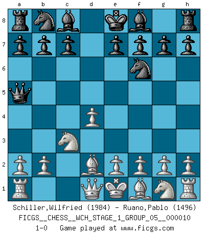 Last move : 1-0 2012 February 6 7:7:11 [Event "FICGS__CHESS__WCH_STAGE_1_GROUP_05__000010"] [Site "FICGS"] [Date "2012.01.01"] [Round "1"] [White "Schiller,Wilfried"] [Black "Ruano,Pablo"] [Result "1-0"] [WhiteElo "1984"] [BlackElo "1496"] 1.d4 Nf6 2.c4 d5 3.cxd5 Qxd5 4.Nc3 Qa5 5.Bd2 1-0 This chess game has been lost on time (started : 2012.01.01 23:15:22) Queen's pawn game Player White won this chess game. Follow this game move after move (download)Bobby Fischer is the greatest Chess player who has ever lived. (Ken Smith) Ich würde mich als ganz normalen Jungen bezeichnen [Im Alter von 12]. (Sergej Karjakin) ¿Quién es tu oponente esta tarde? Esta tarde mi oponente son las piezas negras. (Akiba Rubinstein) Les Cavaliers se révèlent fort utiles dans les positions fermées. D'habitude, les Fous sont un peu plus forts que les Cavaliers dans les positions ouvertes. Qu'on le veuille ou non, il restera toujours des exceptions ! Logic : The art of thinking and reasoning in strict accordance with the limitations and incapacities of the human misunderstanding. (Ambrose Bierce)
