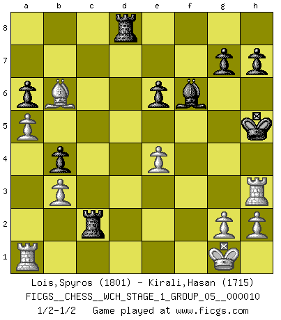 Last move : 1/2-1/2 2012 March 1 23:5:13 [Event "FICGS__CHESS__WCH_STAGE_1_GROUP_05__000010"] [Site "FICGS"] [Date "2012.01.01"] [Round "1"] [White "Lois,Spyros"] [Black "Kirali,Hasan"] [Result "1/2-1/2"] [WhiteElo "1801"] [BlackElo "1715"] 1.e4 e5 2.Nf3 Nc6 3.Bb5 Nf6 4.O-O Nxe4 5.d4 Nd6 6.Bxc6 dxc6 7.dxe5 Nf5 8.Qxd8+ Kxd8 9.Nc3 Ke8 10.Rd1 Be6 11.Ng5 Bc8 12.Nge4 b6 13.b3 Bb7 14.Bf4 Be7 15.e6 fxe6 16.Bxc7 c5 17.a4 Kf7 18.a5 b5 19.f3 Bc6 20.Kf2 b4 21.Ne2 Rac8 22.Be5 Bxe4 23.fxe4 Nd4 24.Nxd4 cxd4 25.Bxd4 Rxc2+ 26.Kg1 a6 27.Rf1+ Kg6 28.Rf3 Bh4 29.Rh3 Rd8 30.Bb6 Bf6 31.Rg3+ Kh5 32.Rh3+ 1/2-1/2 Ruy Lopez : Berlin defense, Open variation Kingside Castling by player White (move 4) This chess game ended in a draw. Follow this game move after move (download)You have to have the fighting spirit. You have to force moves and take chances. (Bobby Fischer) Matt entspricht nicht immer den Tatsachen. (Savielly Grigorievitsch Tartakower) No nos podemos resistir a la fascinación de un sacrificio ya que la pasión por los sacrificios es parte de la naturaleza de un jugador de Ajedrez. (Rudolf Spielman) Même si l'adversaire joue le coup analysé précédemment, recommencez l'analyse en voyant la nouvelle position. Première règle de Blumenfeld The beginning of wisdom is silence. The second step is listening. (Unknown)