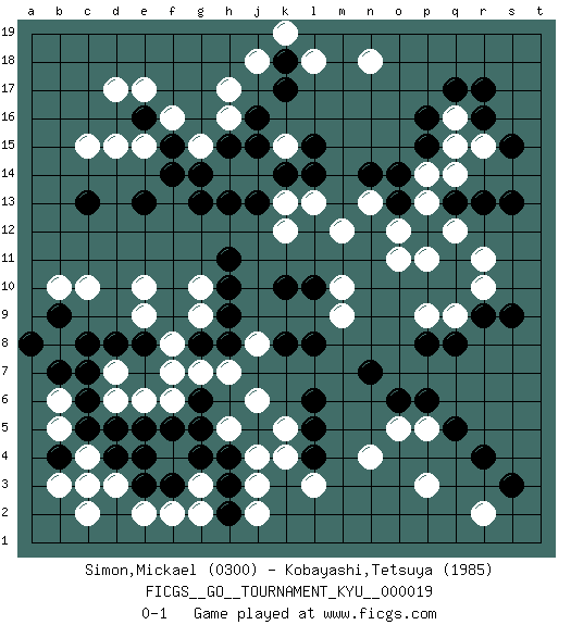 Last move : 0-1 2007 June 22 12:57:43 [Event "FICGS__GO__TOURNAMENT_KYU__000019 "] [Site "FICGS"] [Date "2007.01.11"] [Round "1"] [Black "Simon,Mickael "] [White "Kobayashi,Tetsuya "] [Result "0-1"] [Rating 1 "0300"] [Rating 2 "1985"] 1.r17 c4 2.r4 d17 3.e3 j3 4.c3 b3 5.d4 c2 6.c5 d3 7.b4 c3 8.e5 e2 9.f3 c10 10.c8 q16 11.r16 q15 12.q17 r15 13.p16 r11 14.k17 p3 15.q5 n4 16.r9 d15 17.c13 c15 18.e13 e10 19.e8 g10 20.g13 h17 21.j16 g15 22.j13 h14 23.h13 k15 24.j15 j14 25.k14 h16 26.l15 k13 27.l14 k12 28.h11 m12 29.h10 g9 30.k10 g7 31.g5 j8 32.l8 j6 33.l5 k4 34.l4 l3 35.j5 k5 36.l6 h5 37.p15 p14 38.o14 p13 39.o13 m10 40.n7 o11 41.r13 o12 42.p12 q12 43.s15 q14 44.q13 p11 45.s13 q9 46.q8 p9 47.p8 r10 48.s9 n13 49.n14 l13 50.l10 m9 51.k8 d6 52.d5 b6 53.c6 b5 54.b7 d7 55.d8 f6 56.h4 j4 57.h3 f2 58.h2 j2 59.b9 e6 60.c7 f4 61.f5 b10 62.a8 g3 63.e4 g2 64.g4 r2 65.s3 p5 66.p6 o5 67.o6 j18 68.k18 k19 69.g6 f7 70.h8 h7 71.g8 f8 72.h9 e9 73.g14 l18 74.f15 f16 75.e16 e15 76.f14 e17 77.h15 n18 0-1 Here are the names of the openings (joseki) played in the four corners : Corner d4 : c4 e3Komoku (Somok, Xiao~mu`) 3-4 Point. The komoku (3-4) point is the traditional corner enclosure move..Ikken Kakari (Hankan Keolch'im, Yi Gua`jiao~, 1-Space Low Pincer). The small knight move is the basic approach move to the 3-4 point stone. It has been continually used for over four centuries. There are limitless variations, with new moves constantly being discovered. Black 2 opens the door to a treaure store of joseki. Corner q16 : r17 q16San-San (Sam-Sam, San-San) 3-3 Point. The San-San (3-3) point, emphasizing territory at the expense of influence.Kata-tsuki (shoulder hit). The shoulder-hit is the traditional answer to the 3-3. The direction of Black 3 depends on the positions on the side. Crawling once may be the premise for a follow-up move of sliding with a knight's move in the opposite direction. If Black plays 3 at 3-4 (to the right), the follow-on knight's move is then played at the top (e.g. 3-4, 4-5, 5-2). Black's knight's move reduces territory potential on the side it is played. Corner q4 : r4 p3Komoku (Somok, Xiao~mu`) 3-4 Point. The komoku (3-4) point is the traditional corner enclosure move..Ikken Kakari (Hankan Keolch'im, Yi Gua`jiao~, 1-Space Low Pincer). The small knight move is the basic approach move to the 3-4 point stone. It has been continually used for over four centuries. There are limitless variations, with new moves constantly being discovered. White 2 opens the door to a treaure store of joseki. Player White won this Go (weiqi, baduk) game.Follow this game move after move (download ) The enemy's vital point is your own. (Anonymous) The various flowers seem good to different people. (Chinese proverb)