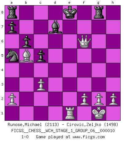 Last move : 1-0 2012 February 22 2:51:46 [Event "FICGS__CHESS__WCH_STAGE_1_GROUP_06__000010"] [Site "FICGS"] [Date "2012.01.01"] [Round "1"] [White "Runose,Michael"] [Black "Cirovic,Zeljko"] [Result "1-0"] [WhiteElo "2113"] [BlackElo "1498"] 1.d4 Nf6 2.c4 e6 3.Nf3 d5 4.Nc3 dxc4 5.e4 Bb4 6.Bg5 h6 7.Bxf6 Bxc3+ 8.bxc3 gxf6 9.Bxc4 Nc6 10.O-O Rg8 11.Qd2 Bd7 12.Rfb1 Na5 13.Bf1 b6 14.Qxh6 Qe7 15.Ba6 Bc6 16.d5 exd5 17.exd5 Bxd5 18.Re1 Be6 19.Nd4 c5 20.Nf5 Bxf5 21.Bb5+ Bd7 22.Qxf6 Qe6 23.Rxe6+ fxe6 24.Qxe6+ Kf8 25.Qf6+ Ke8 26.Re1+ 1-0 Queen's pawn game Kingside Castling by player White (move 10) Player White won this chess game. Follow this game move after move (download)Everything is in a state of flux, and this includes the world of Chess. (Mikhail Botvinnik) Die jungen Leute sollen verstehen, dass sie noch etwas von mir lernen können und müssen. (Viktor Kortschnoi) ¿Esta Bobby Fischer algo cuerdo?. (Salo Flohr) Dieu déplace le joueur, et celui-ci la pièce. Quel Dieu derrière Dieu commence donc la trame ? Arturo Perez-Reverte (prix de littérature policière 1993). Faith : not wanting to know what is true. (Friedrich Nietzsche)