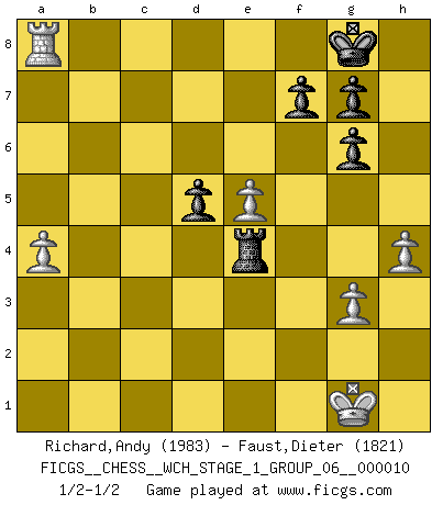 Last move : 1/2-1/2 2012 February 13 13:25:10 [Event "FICGS__CHESS__WCH_STAGE_1_GROUP_06__000010"] [Site "FICGS"] [Date "2012.01.01"] [Round "1"] [White "Richard,Andy"] [Black "Faust,Dieter"] [Result "1/2-1/2"] [WhiteElo "1983"] [BlackElo "1821"] 1.d4 d5 2.Nf3 c6 3.c4 Nf6 4.Nc3 dxc4 5.a4 Bf5 6.e3 e6 7.Bxc4 Bb4 8.O-O O-O 9.Qe2 Nbd7 10.e4 Bg6 11.Bd3 Bh5 12.Bf4 Re8 13.e5 Nd5 14.Nxd5 exd5 15.Bf5 Bg6 16.Bxg6 hxg6 17.Rfd1 a5 18.Bd2 Qb6 19.Qd3 Nf8 20.h4 Ne6 21.Bxb4 Qxb4 22.b3 Rad8 23.Rac1 c5 24.dxc5 Nxc5 25.Qd4 Qxd4 26.Nxd4 Ne6 27.Nxe6 Rxe6 28.f4 Rc6 29.Rxc6 bxc6 30.Rc1 Rb8 31.Rxc6 Rxb3 32.Ra6 Rb4 33.Rxa5 Rxf4 34.g3 Re4 35.Ra8+ 1/2-1/2 Queen's pawn game Kingside Castling by player White (move 8) Kingside Castling by player Black (move 8) This chess game ended in a draw. Follow this game move after move (download)During a Chess competition a Chessmaster should be a combination of a beast of prey and a monk. (Alexander Alekhine) Smyslow ist ein Beweis dafür, dass ich noch zehn Jahre spielen kann! [der 75 jährige über den 85 jährigen] (Viktor Kortschnoi) El Ajedrez es una guerra en un tablero. El objetivo es aplastar la mente del oponente. (Bobby Fischer) Ce qui caractérise les parties de combat, c'est que si le défenseur a constamment de difficiles problèmes à résoudre, l'attaquant doit chercher sans relâche de nouvelles possibilités d'attaque. (Koblentz) It's not enough to succeed. Others must fail. (Gore Vidal)