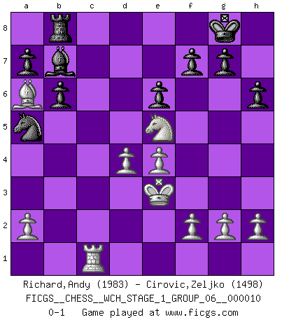 Last move : 0-1 2012 March 27 22:40:15 [Event "FICGS__CHESS__WCH_STAGE_1_GROUP_06__000010"] [Site "FICGS"] [Date "2012.01.01"] [Round "1"] [White "Richard,Andy"] [Black "Cirovic,Zeljko"] [Result "0-1"] [WhiteElo "1983"] [BlackElo "1498"] 1.d4 d5 2.Nf3 Nf6 3.c4 e6 4.Nc3 c5 5.cxd5 Nxd5 6.e4 Nxc3 7.bxc3 cxd4 8.cxd4 Bb4+ 9.Bd2 Bxd2+ 10.Qxd2 Nc6 11.Bc4 Qa5 12.Rb1 Qxd2+ 13.Kxd2 O-O 14.Rhc1 Na5 15.Bd3 b6 16.Rc3 Bb7 17.Ke3 h6 18.Rbc1 Rfc8 19.Rc7 Bc6 20.Rxc8+ Rxc8 21.Ba6 Rb8 22.Ne5 Bb7 0-1 This chess game has been lost on time (started : 2012.01.01 23:16:48) Queen's pawn game Kingside Castling by player Black (move 13) Player Black won this chess game. Follow this game move after move (download)I have always a slight feeling of pity for the man who has no knowledge of Chess. (Siegbert Tarrasch) Das ganze Leben mit einer Ehefrau ist wie ein Endspiel mit ungleichfarbigen Läufern. (Viktor Kortschnoi) Dios mío, Bobby Fischer juega tan simple. (Alexei Suetin) Il (Jacob Murray) ne joue pas pour le bon coup, mais pour le meilleur. (Eloi Relange) We need strong personalities and only one world champion to attract sponsors. (Anatoly Karpov)