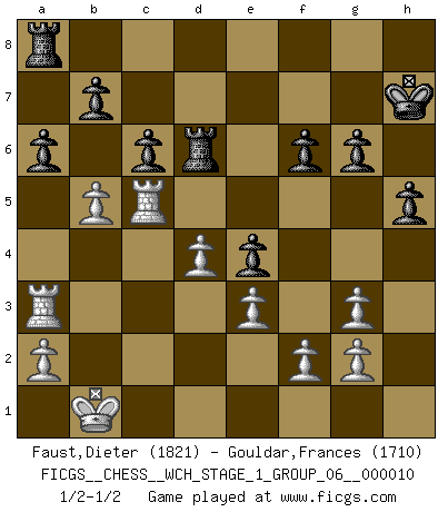 Last move : 1/2-1/2 2012 February 17 14:6:55 [Event "FICGS__CHESS__WCH_STAGE_1_GROUP_06__000010"] [Site "FICGS"] [Date "2012.01.01"] [Round "1"] [White "Faust,Dieter"] [Black "Gouldar,Frances"] [Result "1/2-1/2"] [WhiteElo "1821"] [BlackElo "1710"] 1.d4 d5 2.c4 e6 3.Nc3 Nf6 4.Nf3 Be7 5.Qc2 O-O 6.Bg5 Nbd7 7.e3 Re8 8.O-O-O c6 9.cxd5 exd5 10.Bd3 h6 11.Bf4 Bb4 12.Kb1 Nh5 13.Bg3 Nxg3 14.hxg3 Nf6 15.Rde1 Bxc3 16.Qxc3 Ne4 17.Bxe4 dxe4 18.Ne5 Be6 19.Rc1 Qd5 20.Qa3 Rec8 21.Rc5 Qd6 22.Rhc1 Bd5 23.Ra5 Qxa3 24.Rxa3 Rd8 25.b4 Kh7 26.Ng4 a6 27.Nh2 Rd6 28.Ng4 Be6 29.Ne5 f6 30.Nc4 Bxc4 31.Rxc4 h5 32.Rc5 g6 33.b5 1/2-1/2 Comment by player 2 : Frances Gouldar : hello QGD : 4.Nf3 Kingside Castling by player Black (move 5) Queenside Castling by player White (move 8) This chess game ended in a draw. Follow this game move after move (download)Chess is in its essence a game, in its form an art, and in its execution a science. (Baron Tassilo) Zu meiner Zeit war ein 20 jähriger ein junger Spieler, heute ist er ein Veteran. (Garry Kasparov) El Ajedrez, como cualquier otra actividad creativa, puede existir solo a través de méritos combinados de aquellos que tienen talento creativo y de aquellos que tienen la habilidad de organizar un trabajo creativo. (Mikhail Botvinnik) On croit qu'il y a plus de mauvais joueurs que de bons joueurs, c'est faux : Il y a autant de joueurs qui gagnent que de joueurs qui perdent. (Philippe Geluck) Pretend inferiority and encourage his arrogance. (Sun Tzu)