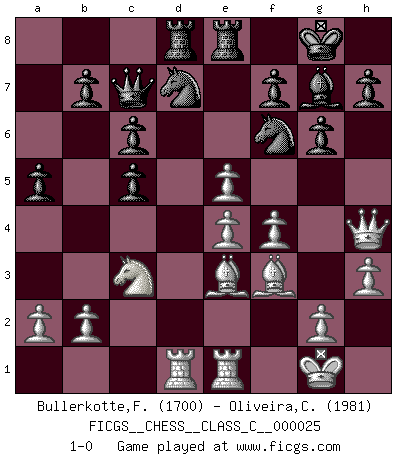 Last move : 1-0 2007 February 22 23:43:38 [Event "FICGS__CHESS__CLASS_C__000025"] [Site "FICGS"] [Date "2007.01.12"] [Round "1"] [White "Bullerkotte,Frank"] [Black "Oliveira,Carlos"] [Result "1-0"] [WhiteElo "1700"] [BlackElo "1981"] 1.d4 d6 2.c4 c6 3.e4 Qc7 4.Nc3 e5 5.f4 Nf6 6.Nf3 Bg4 7.Be2 Nbd7 8.Be3 Be7 9.O-O O-O 10.h3 Bxf3 11.Bxf3 Rfe8 12.Qc2 Bf8 13.Rad1 a5 14.Rfe1 Rad8 15.Qf2 g6 16.Qh4 Bg7 17.c5 dxc5 18.dxe5 1-0 Old Indian defense Kingside Castling by player White (move 9) Kingside Castling by player Black (move 9) Player White won this chess game. Follow this game move after move (download)The blunders are all there on the board, waiting to be made. (Savielly Tartakover) Kombinieren und Schwarzhandel gehören verboten. (Savielly Grigorievitsch Tartakower) Si tu oponente te ofrece un empate, trata de averiguar porque piensa él que esta en una posición peor. (Nigel Short) Le profane ne songe pas à la somme de jouissance dont il se prive, qui méconnaît ce jeu aux ressources aussi variées que passionnantes. (Jean-Marie Jeanton-Lamarche) Locking firmely the window serves nothing, only small thiefs pass through there, the big thiefs enter through the front door. (Luc-Olivier Leclerc)
