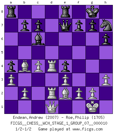 Last move : 1/2-1/2 2012 February 12 1:24:22 [Event "FICGS__CHESS__WCH_STAGE_1_GROUP_07__000010"] [Site "FICGS"] [Date "2012.01.01"] [Round "1"] [White "Endean,Andrew"] [Black "Roe,Philip"] [Result "1/2-1/2"] [WhiteElo "2007"] [BlackElo "1705"] 1.d4 Nf6 2.c4 Nc6 3.Nf3 e6 4.Nc3 Bb4 5.Qc2 d6 6.Bd2 O-O 7.a3 Bxc3 8.Bxc3 Qe7 9.e3 a5 10.Be2 a4 11.O-O e5 12.dxe5 dxe5 13.h3 Re8 14.Rad1 e4 15.Nd4 Nxd4 16.Rxd4 Bd7 17.Rfd1 Bc6 18.Bb4 Qe5 19.R1d2 h6 20.Bc3 Qe7 21.Qd1 Nh7 22.Bg4 Nf6 23.Bb4 Qe5 24.Be2 Nh7 25.Bc3 Qe7 26.Bb4 1/2-1/2 Kevitz-Trajkovich defense Kingside Castling by player Black (move 6) Kingside Castling by player White (move 11) This chess game ended in a draw. Follow this game move after move (download)The mistakes are there, waiting to be made. (Savielly Tartakower) Nicht daß Diemer aus Opportunismus Mitglied der NSDAP geworden wäre. Er war ein Fanatiker, in allem, was er tat. (Hans Ree) No hay precio que no valga la pena por la cabellera del Rey enemigo. (Koblentz) La tactique, c'est ce que vous faites quand il y a quelque chose à faire; la stratégie, c'est ce que vous faites quand il n'y a rien à faire. (Savielli Tartacower) Life is painting a picture, not doing a sum. (Oliver Wendell Holmes, Jr.)