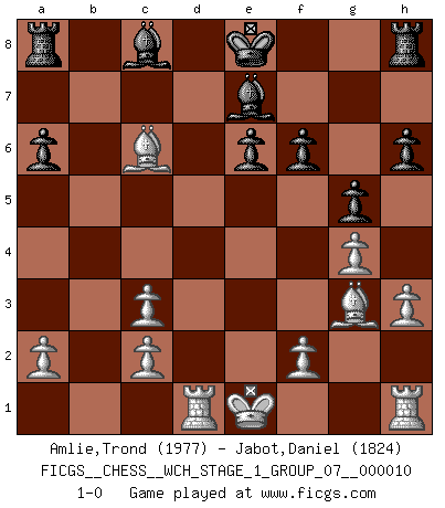Last move : 1-0 2012 March 5 19:17:58 [Event "FICGS__CHESS__WCH_STAGE_1_GROUP_07__000010"] [Site "FICGS"] [Date "2012.01.01"] [Round "1"] [White "Amlie,Trond"] [Black "Jabot,Daniel"] [Result "1-0"] [WhiteElo "1977"] [BlackElo "1824"] 1.e4 c5 2.Nf3 d6 3.d4 cxd4 4.Nxd4 Nf6 5.Nc3 e6 6.g4 h6 7.Bg2 Nc6 8.h3 a6 9.Be3 g5 10.Nxc6 bxc6 11.e5 Nd5 12.Bd4 dxe5 13.Bxe5 f6 14.Bg3 Nxc3 15.bxc3 Qxd1+ 16.Rxd1 Be7 17.Bxc6+ 1-0 Sicilian : Scheveningen, Keres attack Player White won this chess game. Follow this game move after move (download)Discovered check is the dive bomber of the Chessboard. (Reuben Fine) Die Elozahlen sind sehr schlecht für das Schach. Jetzt ist Schach eine Sportindustrie, die darauf zielt Elopunkte zu machen. (Miguel Najdorf) En la perfecta combinación de Ajedrez como en una historia corta de primera clase, toda la trama y contra trama deberá conducir hacia un final sorprendente, el interes no es mitigado hasta el último momento. (Yates and Winter) On n'a jamais que l'âge auquel on a commence à jouer aux échecs car après on cesse de vieillir. (Capablanca) The Internet is the world's largest library. It's just that all the books are on the floor. (John Allen Paulos)