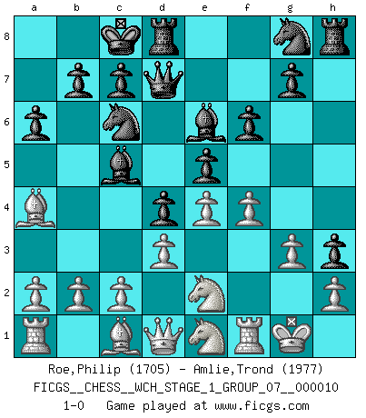 Last move : 1-0 2012 February 26 8:0:52 [Event "FICGS__CHESS__WCH_STAGE_1_GROUP_07__000010"] [Site "FICGS"] [Date "2012.01.01"] [Round "1"] [White "Roe,Philip"] [Black "Amlie,Trond"] [Result "1-0"] [WhiteElo "1705"] [BlackElo "1977"] 1.Nc3 d5 2.e4 d4 3.Nce2 e5 4.Ng3 Be6 5.Nf3 f6 6.Be2 Qd7 7.O-O Nc6 8.Bb5 a6 9.Ba4 h5 10.d3 h4 11.Ne2 h3 12.g3 O-O-O 13.Ne1 Bc5 14.f4 1-0 This chess game has been lost on time (started : 2012.01.01 23:18:9) Dunst (Sleipner, Heinrichsen) Opening Kingside Castling by player White (move 7) Queenside Castling by player Black (move 12) Player White won this chess game. Follow this game move after move (download)Chess is a sea in which a gnat may drink and an elephant may bathe. (Hindu proverb) Lisa Lane, amerikanische Schachmeisterin, hatte Fischer einmal als stärksten lebenden Spieler bezeichnet. Antwort: Das ist richtig, aber Lisa Lane ist eigentlich nicht in der Lage, das zu beurteilen. (Robert James Fischer) Los problemas de Ajedrez exigen del compositor las mismas virtudes que caracterizan todo el arte de valor: originalidad, invención, concisión, armonía, complejidad e insinceridad explendida. (Vladimir Nabokov) Mais l'homme est une créature légère et illogique : semblable au joueur d'échecs, il n'aime que le processus du but à atteindre, non le but lui-même. (Dostoïevsky) If you don't practice you don't deserve to win. (Andre Agassi)
