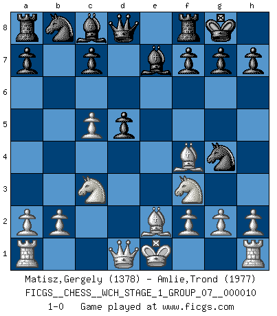 Last move : 1-0 2012 April 1 11:0:35 [Event "FICGS__CHESS__WCH_STAGE_1_GROUP_07__000010"] [Site "FICGS"] [Date "2012.01.01"] [Round "1"] [White "Matisz,Gergely"] [Black "Amlie,Trond"] [Result "1-0"] [WhiteElo "1378"] [BlackElo "1977"] 1.e3 e5 2.d4 exd4 3.exd4 d5 4.Nf3 Bd6 5.c4 Nf6 6.c5 Be7 7.Nc3 O-O 8.Be3 b6 9.Be2 Ng4 10.Bf4 bxc5 11.dxc5 1-0 This chess game has been lost on time (started : 2012.01.01 23:18:9) Van't Kruijs Opening Kingside Castling by player Black (move 7) Player White won this chess game. Follow this game move after move (download)Morphy was probably the greatest genius of them all. (Bobby Fischer) Wenn Du einsam bist, wenn Du Dich in der Welt wie ein Fremder fühlst, spiele Schach. Das wird Deinen Geist erheben und Dein Ratgeber im Kampf sein. (Aristoteles) Hoy en día, si tu no eres un Gran Maestro a los 14 años, es mejor que lo olvides. (Anand Viswanathan) Je menace de comprendre la position. (Anonyme) The good fighters of old first put themselves beyond the possibility of defeat, and then waited for an opportunity of defeating the enemy. (Sun Tzu)