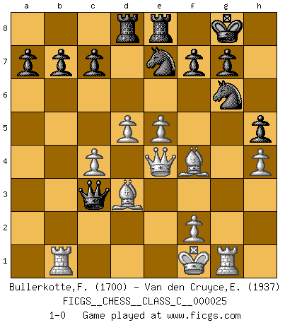 Last move : 1-0 2007 May 12 2:42:32 [Event "FICGS__CHESS__CLASS_C__000025"] [Site "FICGS"] [Date "2007.01.12"] [Round "1"] [White "Bullerkotte,Frank"] [Black "Van den Cruyce,Els"] [Result "1-0"] [WhiteElo "1700"] [BlackElo "1937"] 1.d4 d5 2.c4 Nc6 3.Nf3 Bg4 4.cxd5 Bxf3 5.gxf3 Qxd5 6.e3 e5 7.Nc3 Bb4 8.Bd2 Bxc3 9.bxc3 Qd6 10.f4 exf4 11.e4 Nge7 12.Qf3 Ng6 13.e5 Qe7 14.Qe4 O-O 15.h4 Qa3 16.Bd3 Rfe8 17.Kf1 h5 18.Rg1 Qb2 19.Rd1 Qxa2 20.Bxf4 Qb3 21.Re1 Nce7 22.c4 Rad8 23.Rb1 Qc3 24.d5 1-0 QGD : Chigorin defense Kingside Castling by player Black (move 14) Player White won this chess game. Follow this game move after move (download)Chess is a fighting game which is purely intellectual and includes chance. (Richard Reti) Ich glaube nicht an Psychologie, ich glaube an gute Züge. (Robert James Fischer) A través de las casillas del tablero, los Indios explican el movimiento del tiempo y la edad, las influencias mas altas que controlan el mundo y los lazos que vinculan al Ajedrez con el alma humana. (Al-Masudi) L'ordinateur a tué l'originalité. Il n'y a plus guère d'aventures sur l'échiquier. (Jacob Murray) O divine art of subtlety and secrecy! Through you we learn to be invisible, through you inaudible and hence we can hold the enemy's fate in our hands. (Sun Tzu)