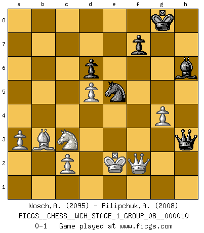 Last move : 0-1 2012 February 23 14:56:33 [Event "FICGS__CHESS__WCH_STAGE_1_GROUP_08__000010"] [Site "FICGS"] [Date "2012.01.01"] [Round "1"] [White "Wosch,Arkadiusz"] [Black "Pilipchuk,Andrey"] [Result "0-1"] [WhiteElo "2095"] [BlackElo "2008"] 1.e4 c5 2.Nf3 Nc6 3.d4 cxd4 4.Nxd4 Nf6 5.Nc3 e5 6.Ndb5 d6 7.Bg5 a6 8.Na3 b5 9.Bxf6 gxf6 10.Nd5 f5 11.Bd3 Be6 12.O-O Bxd5 13.exd5 Ne7 14.Nxb5 Bg7 15.Nc3 e4 16.Bc4 O-O 17.Bb3 Ng6 18.Qd2 Re8 19.Ba4 Re5 20.g3 Rb8 21.f4 exf3 22.Rxf3 h5 23.Raf1 h4 24.a3 Rxb2 25.Bb3 hxg3 26.hxg3 Qe7 27.Rxf5 Rxf5 28.Rxf5 a5 29.Rf3 a4 30.Nxa4 Rb1+ 31.Rf1 Rxf1+ 32.Kxf1 Qe4 33.Qe1 Qf3+ 34.Qf2 Qh5 35.Ke1 Ne5 36.Kd2 Qh1 37.Ke2 Bh6 38.Nc3 Qh5+ 39.g4 Qh3 0-1 Sicilian : Pelikan (Lasker/Sveshnikov) variation Kingside Castling by player White (move 12) Kingside Castling by player Black (move 16) Player Black won this chess game. Follow this game move after move (download)Fischer sacrificed virtually everything most of us weakies (to use his term) value, respect, and cherish, for the sake of an artful, often beautiful board game, for the ambivalent privilege of being its greatest master. (Paul Kollar) Wenn du gegen Bobby spielst, ist es keine Frage von gewinnen oder verlieren. Es ist eine Frage des Überlebens. (Boris Vassilievich Spassky) Combinaciones deslumbrantes son para la mayoría, mover madera es para los pocos. (Georg Kieninger) L'attaque fait le spectacle, la défense gagne les matchs. (Dicton footballistique) The faster the computer, the slower the brain. (Thibault de Vassal)
