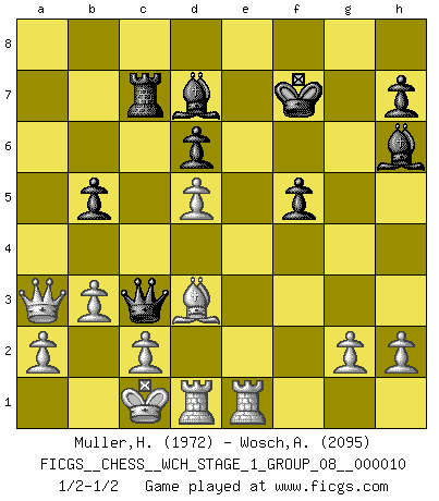 Last move : 1/2-1/2 2012 February 26 9:23:33 [Event "FICGS__CHESS__WCH_STAGE_1_GROUP_08__000010"] [Site "FICGS"] [Date "2012.01.01"] [Round "1"] [White "Muller,Henri-Louis"] [Black "Wosch,Arkadiusz"] [Result "1/2-1/2"] [WhiteElo "1972"] [BlackElo "2095"] 1.e4 c5 2.Nf3 Nc6 3.d4 cxd4 4.Nxd4 Nf6 5.Nc3 d6 6.Bg5 e6 7.Qd2 a6 8.O-O-O Bd7 9.f4 b5 10.Bxf6 gxf6 11.Kb1 Qb6 12.Nxc6 Bxc6 13.Qe1 Ra7 14.Bd3 Rg8 15.Rg1 a5 16.f5 a4 17.Qh4 Rg5 18.Rge1 a3 19.fxe6 Qd4 20.exf7+ Kxf7 21.Qh3 Bd7 22.Qe3 Qb4 23.b3 Rc7 24.Nd5 Rxd5 25.exd5 Qc3 26.Qc1 f5 27.Qxa3 Bg7 28.Kc1 Bh6+ 29.Kb1 Bg7 30.Kc1 Bh6+ 1/2-1/2 Sicilian defense Queenside Castling by player White (move 8) This chess game ended in a draw. Follow this game move after move (download)I am the best player in the world and I am here to prove it. (Bobby Fischer) Schach ist ein Kampf gegen den Fehler. (Johannes Herrman Zukertort) Dios mío, Bobby Fischer juega tan simple. (Alexei Suetin) Avant la finale, les dieux ont créé le milieu de partie. (Tarrasch) I feel so... helpless. (C-3PO in Star Wars ep.3)