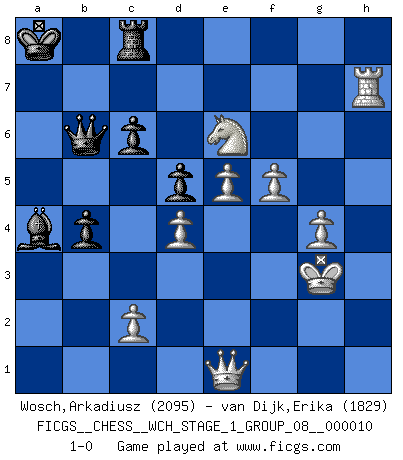 Last move : 1-0 2012 April 16 0:51:23 [Event "FICGS__CHESS__WCH_STAGE_1_GROUP_08__000010"] [Site "FICGS"] [Date "2012.01.01"] [Round "1"] [White "Wosch,Arkadiusz"] [Black "van Dijk,Erika"] [Result "1-0"] [WhiteElo "2095"] [BlackElo "1829"] 1.e4 e6 2.d4 d5 3.Nc3 Bb4 4.e5 b6 5.a3 Bf8 6.Nf3 Ne7 7.h4 h6 8.Be3 Nf5 9.Bf4 Be7 10.Bb5+ c6 11.Bd3 Ba6 12.Bxf5 exf5 13.h5 Nd7 14.Ne2 Nf8 15.Ng3 Bc8 16.Be3 Be6 17.Qd3 Qd7 18.Nh4 Bxh4 19.Rxh4 O-O-O 20.Rh1 Nh7 21.a4 Ng5 22.f3 Kb7 23.a5 b5 24.a6+ Ka8 25.Kf2 Rb8 26.Bd2 b4 27.Ra5 Rb6 28.Rha1 Rhb8 29.b3 Qc8 30.Bf4 Rb5 31.Rxb5 Rxb5 32.Ra4 Rb6 33.Bd2 Qf8 34.Bxg5 hxg5 35.Nxf5 Qh8 36.g4 g6 37.Ng3 Bc8 38.Kg2 gxh5 39.Nxh5 Qd8 40.Nf6 Qe7 41.Ra1 Qf8 42.Kg3 Be6 43.Rh1 Rb8 44.Rh5 Qd8 45.Nh7 Bc8 46.Nxg5 Qb6 47.Nxf7 Bxa6 48.Qe3 Qc7 49.Rh7 Bb5 50.f4 a5 51.Ng5 Qb6 52.Ne6 Rc8 53.f5 a4 54.bxa4 Bxa4 55.Qe1 1-0 French : Winawer, Advance variation Queenside Castling by player Black (move 19) Player White won this chess game. Follow this game move after move (download)Pawns: they are the soul of this game, they alone form the attack and defense. (Philidor) Im Spitzenschach von heute geht es nur um Vorbereitung, um tiefgründige, sorgfältige Eröffnungsvorbereitung. (Nigel Short) El Ajedrez es parte de una cultura y si una cultura esta en decadencia, entonces también el Ajedrez declinará. (Mikhail Botvinnik) Dieu déplace le joueur, et celui-ci la pièce. Quel Dieu derrière Dieu commence donc la trame ? Arturo Perez-Reverte (prix de littérature policière 1993). Players are not good because they find tactics, it is about the way to find the positions in which those tactics are hidden. (Luc-Olivier Leclerc)