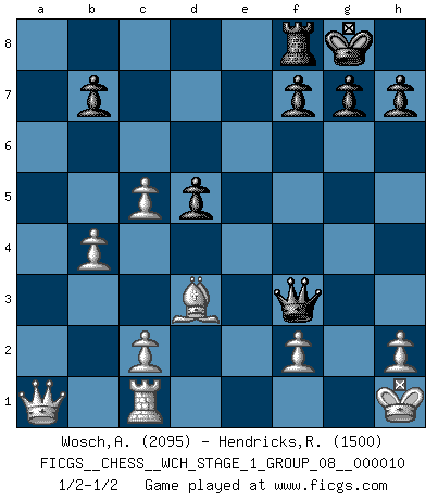 Last move : 1/2-1/2 2012 February 18 8:56:50 [Event "FICGS__CHESS__WCH_STAGE_1_GROUP_08__000010"] [Site "FICGS"] [Date "2012.01.01"] [Round "1"] [White "Wosch,Arkadiusz"] [Black "Hendricks,Richard"] [Result "1/2-1/2"] [WhiteElo "2095"] [BlackElo "1500"] 1.e4 d5 2.exd5 Qxd5 3.Nc3 Qa5 4.d4 c6 5.Nf3 Bf5 6.Bc4 e6 7.Bd2 Qc7 8.Nh4 Bg6 9.Qf3 Nf6 10.Qh3 Be4 11.O-O Bd5 12.Bd3 Bd6 13.Rac1 O-O 14.Rfe1 Bf4 15.Bxf4 Qxf4 16.Ne2 Qh6 17.Qg3 c5 18.dxc5 Nbd7 19.b4 a5 20.a3 axb4 21.axb4 Ra4 22.Nd4 Nh5 23.Qd6 Nf4 24.Qxd7 Qxh4 25.Qxa4 Nxg2 26.Re5 Qxd4 27.Qa1 Qh4 28.Rxd5 exd5 29.Kxg2 Qg4+ 30.Kh1 Qf3+ 1/2-1/2 Scandinavian (centre counter) defense Kingside Castling by player White (move 11) Kingside Castling by player Black (move 13) This chess game ended in a draw. Follow this game move after move (download)Different people feel differently about resigning. (Bobby Fischer) Als er Schachweltmeister wurde ließ er praktisch alle stärksten Sovietspieler für sich arbeiten. Wenn ein auch nur mittelmässiger Meister ein Spezialist für eine bestimmte Eröffnung war, wurde er von Karpov gerufen. Das wurde alles geheim gehalten. (Mikhail Moiseyevich Botvinik) El Ajedrez es un cuento de Hadas de las 1001 metidas de pata. (Savielly Tartakower) Des idées, des idées, j'en ai cent, j'en ai mille. Des bonnes, des mauvaises, applicables, irréalisables... Il suffit de faire le tri ! (Roos) When you've done things right people won't know you've done anything at all. (Futurama)