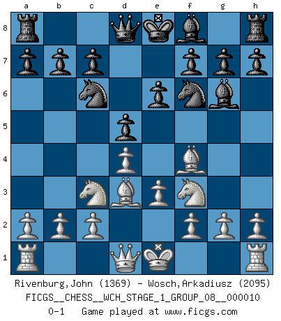 Last move : 0-1 2012 February 9 19:19:18 [Event "FICGS__CHESS__WCH_STAGE_1_GROUP_08__000010"] [Site "FICGS"] [Date "2012.01.01"] [Round "1"] [White "Rivenburg,John"] [Black "Wosch,Arkadiusz"] [Result "0-1"] [WhiteElo "1369"] [BlackElo "2095"] 1.d4 Nf6 2.Nc3 d5 3.Bf4 Bf5 4.e3 e6 5.Bd3 Bg6 6.Nf3 Nc6 0-1 This chess game has been lost on time (started : 2012.01.01 23:19:17) Queen's pawn game Player Black won this chess game. Follow this game move after move (download)If a ruler does not understand Chess, how can he rule over a kingdom ? (King Khusros II) Ohne Leiden bildet sich kein Charakter. (Ernst Freiherr von Feuchtersleben) En la perfecta combinación de Ajedrez como en una historia corta de primera clase, toda la trama y contra trama deberá conducir hacia un final sorprendente, el interes no es mitigado hasta el último momento. (Yates and Winter) Le temps de noter son nom sur la feuille de partie, j'étais déjà en zeitnot ! D'un modeste amateur apparié lors de la première ronde d'un open contre le grand-maître Azmaïparashvili. If you have any trouble condescending, find a Unix user to show you how it's done. (Scott Adams)
