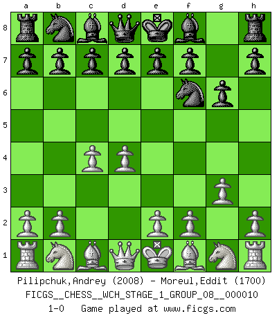 Last move : 1-0 2012 February 8 19:14:12 [Event "FICGS__CHESS__WCH_STAGE_1_GROUP_08__000010"] [Site "FICGS"] [Date "2012.01.01"] [Round "1"] [White "Pilipchuk,Andrey"] [Black "Moreul,Eddit"] [Result "1-0"] [WhiteElo "2008"] [BlackElo "1700"] 1.d4 Nf6 2.c4 g6 3.g3 1-0 This chess game has been lost on time (started : 2012.01.01 23:19:17) King's Indian : 3.g3 Player White won this chess game. Follow this game move after move (download)Half the variations which are calculated in a tournament game turn out to be completely superfluous. Unfortunately, no one knows in advance which half. (Jan Tinman) Ein Schachgenie ist jemand der verdammt gut Schach spielt. (Jonathan Levitt) Ayuda a tus piezas para que ellas te puedan ayudar. (Paul Morphy) Pour moi, les échecs ne sont pas un jeu mais un art. (Alexandre Alekhine) The man who strikes first admits that his ideas have given out. (Chinese proverb)