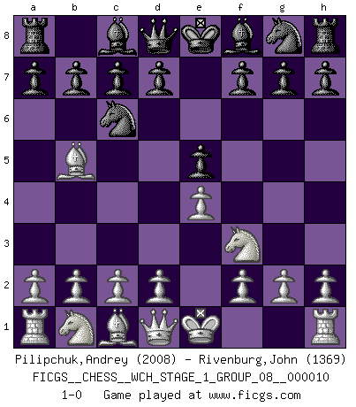 Last move : 1-0 2012 February 8 19:14:12 [Event "FICGS__CHESS__WCH_STAGE_1_GROUP_08__000010"] [Site "FICGS"] [Date "2012.01.01"] [Round "1"] [White "Pilipchuk,Andrey"] [Black "Rivenburg,John"] [Result "1-0"] [WhiteElo "2008"] [BlackElo "1369"] 1.e4 e5 2.Nf3 Nc6 3.Bb5 1-0 This chess game has been lost on time (started : 2012.01.01 23:19:17) Ruy Lopez (Spanish Opening) Player White won this chess game. Follow this game move after move (download)As one by one I mowed them down, my superiority soon became apparent. (Jose Capablanca) Wenn ein Kopf und ein Buch zusammenstoßen und es klingt hohl, ist es denn allemal im Buche? (Georg Christoph Lichtenberg) Un mal día en el Ajedrez, es mejor que cualquier buen día en el trabajo. (Anonymous) On n'a jamais que l'âge auquel on a commence à jouer aux échecs car après on cesse de vieillir. (Capablanca) A journey of a thousand sites begins with a single click. (Author unknown)