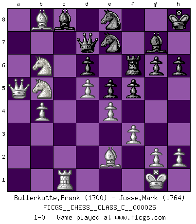 Last move : 1-0 2007 March 2 19:54:8 [Event "FICGS__CHESS__CLASS_C__000025"] [Site "FICGS"] [Date "2007.01.12"] [Round "1"] [White "Bullerkotte,Frank"] [Black "Josse,Mark"] [Result "1-0"] [WhiteElo "1700"] [BlackElo "1764"] 1.d4 Nf6 2.c4 g6 3.Nc3 Bg7 4.e4 O-O 5.Nf3 d6 6.Be2 e5 7.Be3 h6 8.O-O Nc6 9.d5 Ne7 10.Nd2 c6 11.b4 a5 12.a3 cxd5 13.cxd5 axb4 14.axb4 Rxa1 15.Qxa1 Ng4 16.Ba7 f5 17.f3 Nf6 18.Nc4 Qd7 19.Bb8 Ne8 20.Qa5 Kh8 21.Nb5 Rf6 22.Rc1 b6 23.Nxb6 1-0 King's Indian : 4.e4 Kingside Castling by player Black (move 4) Kingside Castling by player White (move 8) Player White won this chess game. Follow this game move after move (download)Fischer is the strongest player in the world. In fact, the strongest player who ever lived. (Larry Evans) Schach ist Leben. (Robert James Fischer) Aquel que teme a un Peón de Reina aislado, debería de retirarse del Ajedrez. (Siegbert Tarrasch) Vouloir jouer aux échecs contre soi-même est aussi paradoxal que vouloir marcher sur son ombre. (Stefan Zweig) If passion drives you, let reason holds the reins. (Benjamin Franklin)
