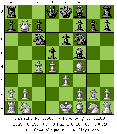 Last move : 1-0 2012 February 7 7:10:19 [Event "FICGS__CHESS__WCH_STAGE_1_GROUP_08__000010"] [Site "FICGS"] [Date "2012.01.01"] [Round "1"] [White "Hendricks,Richard"] [Black "Rivenburg,John"] [Result "1-0"] [WhiteElo "1500"] [BlackElo "1369"] 1.d4 d5 2.Bf4 Bf5 3.c4 Nf6 4.e3 e6 5.Qb3 Nc6 6.Qxb7 1-0 This chess game has been lost on time (started : 2012.01.01 23:19:17) Queen's pawn, Mason variation Player White won this chess game. Follow this game move after move (download)War is the child of passion, passion is the child of narcissism and narcissism is the child. (...) Another game ? (Thibault de Vassal) Ich habe die besten Aussichten, den ersten Preis zu gewinnen - denn jeder muss gegen Steinitz spielen, nur ich nicht! (Wilhelm Steinitz) Haz el enroque temprano y seguido. (Rob Sillars) Les échecs sont utiles à l'exercice de la faculté de penser et à celle de l'imagination. Car nous devons posséder une méthode élaborée pour atteindre des buts partout où nous devons conduire notre raison. (Leibnitz) Gambling is the son of avarice and the father of despair. (French proverb)