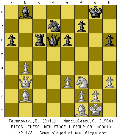 Last move : 1/2-1/2 2012 April 7 11:57:3 [Event "FICGS__CHESS__WCH_STAGE_1_GROUP_09__000010"] [Site "FICGS"] [Date "2012.01.01"] [Round "1"] [White "Teverovski,Bogoljub"] [Black "Nenciulescu,Silviu"] [Result "1/2-1/2"] [WhiteElo "2011"] [BlackElo "1964"] 1.d4 d5 2.c4 c6 3.Nf3 Nf6 4.e3 e6 5.Bd3 Nbd7 6.O-O Be7 7.Nc3 O-O 8.b3 Re8 9.Bb2 Nf8 10.Qc2 Ng6 11.Rac1 Bd6 12.h3 Qe7 13.Rfe1 Rb8 14.Na4 Bc7 15.Red1 Rd8 16.Nc3 Bd7 17.a3 Rbc8 18.Rd2 Be8 19.Qb1 dxc4 20.Bxc4 c5 21.dxc5 Rxd2 22.Nxd2 Qxc5 23.b4 Qe7 24.Be2 Bb8 25.Nb5 Rd8 26.Nd4 Nh4 27.N2f3 Nxf3+ 28.Nxf3 a6 29.Bd4 Bc6 30.Qb2 Nd7 31.Rxc6 bxc6 32.Bxg7 c5 33.Bc3 cxb4 34.axb4 Qd6 35.Qb3 Rc8 36.Bb2 Rc6 37.Bd3 h6 38.Bf1 1/2-1/2 QGD Slav : 4.e3 Kingside Castling by player White (move 6) Kingside Castling by player Black (move 7) This chess game ended in a draw. Follow this game move after move (download)Chess is like life. (Boris Spassky) Schach ist ein Teil der Kultur, und wenn es mit der Kultur abwärts geht, geht es auch mit dem Schach abwärts. (Mikhail Moiseyevich Botvinik) La estratégia requiere pensar, la táctica requiere observación. (Max Euwe) J'ai toujours senti une vague pitié pour l'homme qui ne connaît rien aux échecs, tout comme j'en aurais pour un homme ignorant de l'amour. Les Echecs, comme la musique ou comme l'amour, ont le pouvoir de rendre heureux. (Siegbert Tarrasch) As a goal marker shodan is important. As a destination it is a poor place to stop. (Thomas Tamayo)