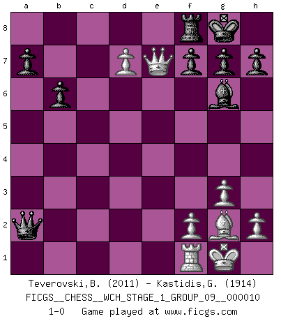 Last move : 1-0 2012 April 19 18:43:54 [Event "FICGS__CHESS__WCH_STAGE_1_GROUP_09__000010"] [Site "FICGS"] [Date "2012.02.12"] [Round "1"] [White "Teverovski,Bogoljub"] [Black "Kastidis,Gerd"] [Result "1-0"] [WhiteElo "2011"] [BlackElo "1914"] 1.d4 Nf6 2.c4 e6 3.Nf3 Bb4+ 4.Bd2 Qe7 5.g3 O-O 6.Bg2 Bxd2+ 7.Qxd2 d6 8.Nc3 e5 9.O-O Nc6 10.Nd5 Nxd5 11.cxd5 Nxd4 12.Nxd4 exd4 13.Rac1 Bf5 14.Qxd4 Qxe2 15.Rxc7 b6 16.Qb4 Rfc8 17.Qxd6 Qxb2 18.Rb7 Qxa2 19.Qe5 Bg6 20.d6 Re8 21.Re7 Rxe7 22.Qxe7 Rf8 23.d7 1-0 Bogo-Indian defense, Nimzovich variation Kingside Castling by player Black (move 5) Kingside Castling by player White (move 9) Player White won this chess game. Follow this game move after move (download)No one ever won a game by resigning. (Unknown) Wenn man heute mit 14 Jahren noch kein GM ist, kann man es vergessen. (Viswanathan Anand) Cuando no sepas que mover, espera por una idea que se le venga a la la cabeza de tu oponente. Tenlo por seguro de que esa idea estará incorrecta. (Siegbert Tarrasch) Les sacrifices démontrent seulement que quelqu'un a gaffé. (Savielly Tartacover) Life is pleasant. Death is peaceful. It's the transition that's troublesome. (Isaac Asimov)