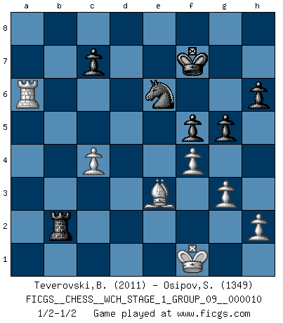 Last move : 1/2-1/2 2012 March 15 22:41:5 [Event "FICGS__CHESS__WCH_STAGE_1_GROUP_09__000010"] [Site "FICGS"] [Date "2012.01.01"] [Round "1"] [White "Teverovski,Bogoljub"] [Black "Osipov,Sergey"] [Result "1/2-1/2"] [WhiteElo "2011"] [BlackElo "1349"] 1.d4 d5 2.c4 e6 3.Nf3 Nf6 4.Nc3 h6 5.e3 a6 6.Be2 dxc4 7.Bxc4 Nbd7 8.e4 b5 9.Be2 b4 10.e5 bxc3 11.exf6 Qxf6 12.bxc3 Bb7 13.Qd3 e5 14.Rb1 Bc6 15.O-O Bd6 16.c4 exd4 17.Nxd4 Nc5 18.Qe3+ Be4 19.Bd3 O-O 20.Bxe4 Qe5 21.Bh7+ Kxh7 22.Qxe5 Bxe5 23.Be3 Bxd4 24.Bxd4 Ne6 25.Be3 Rab8 26.f3 g5 27.Kf2 Rbd8 28.Rfc1 Kg6 29.g3 f5 30.f4 Rd3 31.Rb3 Rxb3 32.axb3 Rb8 33.Ra1 Rxb3 34.Rxa6 Rb2+ 35.Kf1 Kf7 1/2-1/2 Queen's gambit declined Kingside Castling by player White (move 15) Kingside Castling by player Black (move 19) This chess game ended in a draw. Follow this game move after move (download)Winning isn't everything... but losing is nothing. (Mednis) Die Neutralität betrachte ich als eine schwere Krankheit. (Viktor Kortschnoi) El arma más poderosa en el Ajedrez, es tener la próxima movida. (David Bronstein) Il n'y a plus de joueurs du niveau de Jacob Murray dont la seule quête est le beau jeu, le plaisir de voir les pièces construire quelque chose. Sur 10 idées à la minute, 9 seront sans intérêt, la dernière s'avèrera géniale. (Christian Bauer) Hold em is to stud what chess is to checkers. (Johnny Moss)