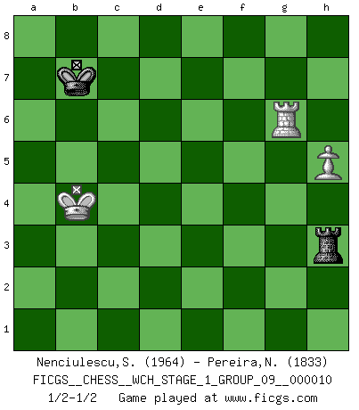 Last move : 1/2-1/2 2012 April 26 4:46:27 [Event "FICGS__CHESS__WCH_STAGE_1_GROUP_09__000010"] [Site "FICGS"] [Date "2012.01.01"] [Round "1"] [White "Nenciulescu,Silviu"] [Black "Pereira,Nilson"] [Result "1/2-1/2"] [WhiteElo "1964"] [BlackElo "1833"] 1.d4 Nf6 2.c4 e6 3.Nf3 d5 4.cxd5 exd5 5.Nc3 Bb4 6.Bg5 Nbd7 7.e3 c5 8.Be2 Qa5 9.O-O O-O 10.Qc2 Bxc3 11.bxc3 Ne4 12.Bd3 Nxg5 13.Nxg5 g6 14.e4 Nb6 15.Rfc1 Bd7 16.Qb2 c4 17.Bf1 h6 18.Nf3 dxe4 19.Nd2 Qd5 20.Qb4 Rac8 21.a4 Qc6 22.a5 e3 23.fxe3 Nd5 24.Qxc4 Qe6 25.Qd3 Qxe3+ 26.Qxe3 Nxe3 27.c4 Rfd8 28.h3 b5 29.axb6 axb6 30.Be2 b5 31.cxb5 Nc2 32.Rab1 Nxd4 33.Rxc8 Nxe2+ 34.Kf2 Bxc8 35.Kxe2 Kf8 36.Ke3 Bb7 37.g4 Ke7 38.b6 Rd5 39.Rc1 Ke6 40.Rc7 Rd7 41.Rc1 Rd5 42.Nb3 Re5+ 43.Kd2 Rd5+ 44.Kc3 Kd6 45.Kb4 Bc6 46.Nc5 Rd4+ 47.Ka3 Rf4 48.b7 Kc7 49.Ne6+ fxe6 50.Rxc6+ Kxb7 51.Rxe6 Rf3+ 52.Kb4 Rxh3 53.Rxg6 h5 54.gxh5 1/2-1/2 Queen's pawn game Kingside Castling by player White (move 9) Kingside Castling by player Black (move 9) 10 pieces endgame at move 50 : White KRPPP , Black KRPPP WHITE : King + 1 Rook 3 Pawns BLACK : King + 1 Rook 3 Pawns 9 pieces endgame at move 50 : White KRPP , Black KRPPP WHITE : King + 1 Rook 2 Pawns BLACK : King + 1 Rook 3 Pawns 8 pieces endgame at move 51 : White KRPP , Black KRPP WHITE : King + 1 Rook 2 Pawns BLACK : King + 1 Rook 2 Pawns 7 pieces endgame at move 52 : White KRP , Black KRPP WHITE : King + 1 Rook 1 Pawn BLACK : King + 1 Rook 2 Pawns 6 pieces endgame at move 53 : White KRP , Black KRP WHITE : King + 1 Rook 1 Pawn BLACK : King + 1 Rook 1 Pawn 5 pieces endgame at move 54 : White KRP , Black KR WHITE : King + 1 Rook 1 Pawn BLACK : King + 1 Rook This chess game ended in a draw. Follow this game move after move (download)Is Bobby Fischer quite sane ? (Salo Flohr) Es liegt in der Natur, vernüftig zu denken und unlogisch zu handeln. (Anatole France) Un buen sacrificio es aquel que aunque no sea necesariamente sólido, deja a tu oponente aturdido y confuso. (Rudolph Spielmann) Karpov est une pièce de musée. (Garry Kasparov) Fear is the path to the dark side. Fear leads to anger; anger leads to hate; hate leads to suffering. I sense much fear in you. (Master Yoda in Star Wars ep.1)