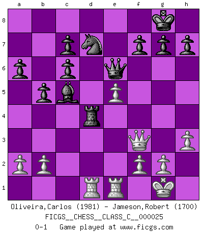 Last move : 0-1 2007 February 14 15:52:37 [Event "FICGS__CHESS__CLASS_C__000025"] [Site "FICGS"] [Date "2007.01.12"] [Round "1"] [White "Oliveira,Carlos"] [Black "Jameson,Robert"] [Result "0-1"] [WhiteElo "1981"] [BlackElo "1700"] 1.e4 e5 2.Nf3 Nc6 3.Bb5 a6 4.Bxc6 dxc6 5.O-O Qd6 6.Na3 b5 7.c4 Bg4 8.h3 Bxf3 9.Qxf3 Nf6 10.d3 Rd8 11.Rd1 Be7 12.Be3 Qe6 13.c5 O-O 14.Nc2 Rd7 15.d4 Rfd8 16.Re1 exd4 17.Nxd4 Rxd4 18.Bxd4 Rxd4 19.e5 Nd7 20.Rad1 Bxc5 0-1 Ruy Lopez : Exchange, Bronstein variation Kingside Castling by player White (move 5) Kingside Castling by player Black (move 13) Player Black won this chess game. Follow this game move after move (download)When your house is on fire, you can't be bothered with the neighbors. Or, as we say in Chess, if your King is under attack you don't worry about losing a Pawn on the Queen's side. (Gary Kasparov) Schach ist das Spiel, das die Verrückten gesund hält. (Albert Einstein) El Ajedrez es un mar en el cual un mosquito puede beber y un elefante puede bañarse. (Refrán Hindú) À la honte des hommes, on sait que les lois du jeu sont les seules qui soient partout justes, claires, inviolables et exécutées. Pourquoi l'Indien qui a donné les règles du jeu d'échecs est-il obéi de bon gré dans toute la terre, et que les décrétales des papes, par exemple, sont aujourd'hui un objet d'horreur et de mépris ? C'est que l'inventeur des échecs combina tout avec justesse pour la satisfaction des joueurs, et que les papes, dans leurs décrétales, n'eurent en vue que leur seul avantage. L'Indien voulut exercer également l'esprit des hommes et leur donner du plaisir; les papes ont voulu abrutir l'esprit des hommes. Voltaire (Dictionnaire philosophique / Garnier 1967) He who fights with monsters should be careful lest he thereby become a monster. (Friedrich Nietzsche, Beyond Good and Evil)