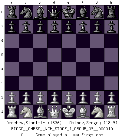 Last move : 0-1 2012 February 1 6:39:34 [Event "FICGS__CHESS__WCH_STAGE_1_GROUP_09__000010"] [Site "FICGS"] [Date "2012.01.01"] [Round "1"] [White "Denchev,Stanimir"] [Black "Osipov,Sergey"] [Result "0-1"] [WhiteElo "1536"] [BlackElo "1349"] 0-1 This chess game has been lost on time (started : 2012.01.01 23:20:32) Player Black won this chess game. Follow this game move after move (download)Chess is a foolish expedient for making idle people believe they are doing something very clever when they are only wasting their time. (George Bernard Shaw) Du musst Deinen Gegner in einen tiefen dunklen Wald führen wo 2+2=5 ist und wo der Weg, der wieder hinausführt, nur breit genug für einen ist. (Mikhail Nekhemyevich Tal) El Ajedrez es como la guerra en un tablero. (Bobby Fischer) La vie et les Echecs sont tous les deux une lutte constante. (Lasker) The Internet is the world's largest library. It's just that all the books are on the floor. (John Allen Paulos)