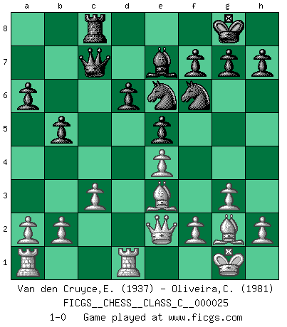 Last move : 1-0 2007 March 5 21:57:2 [Event "FICGS__CHESS__CLASS_C__000025"] [Site "FICGS"] [Date "2007.01.12"] [Round "1"] [White "Van den Cruyce,Els"] [Black "Oliveira,Carlos"] [Result "1-0"] [WhiteElo "1937"] [BlackElo "1981"] 1.d4 d6 2.Nf3 c6 3.g3 Qc7 4.Bg2 Bg4 5.O-O Bxf3 6.Bxf3 e5 7.Nc3 Nf6 8.d5 Nbd7 9.dxc6 bxc6 10.Nb5 cxb5 11.Bxa8 Be7 12.Bg2 O-O 13.e4 Rc8 14.c3 Nc5 15.Qe2 a6 16.Rd1 Ne6 17.Be3 1-0 Queen's Pawn Kingside Castling by player White (move 5) Kingside Castling by player Black (move 12) Player White won this chess game. Follow this game move after move (download)First-class players lose to second-class players because second-class players sometimes play a first-class game. (Siegbert Tarrasch) Taktik ist was man tun muß, wenn etwas zu tun ist. Strategie ist was man tun muß, wenn nichts zu tun ist. (Savielly Grigorievitsch Tartakower) Desconfianza es la característica mas necesaria de un jugador de Ajedrez. (Siegbert Tarrasch) Ce n'est pas pour s'amuser qu'il joue aux échecs : il célèbre un culte. (Vladimir Nabokov) When the going gets tactical, the computers get going. (Hyatt)