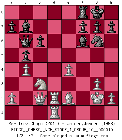 Last move : 1/2-1/2 2012 February 26 3:54:19 [Event "FICGS__CHESS__WCH_STAGE_1_GROUP_10__000010"] [Site "FICGS"] [Date "2012.01.01"] [Round "1"] [White "Martinez,Chapo"] [Black "Walden,Janeen"] [Result "1/2-1/2"] [WhiteElo "2011"] [BlackElo "1958"] 1.d4 d5 2.c4 c6 3.Nc3 Nf6 4.Nf3 e6 5.e3 Nbd7 6.Qc2 Bd6 7.Bd3 dxc4 8.Bxc4 b5 9.Be2 O-O 10.O-O Bb7 11.Rd1 Qc7 12.e4 e5 13.Bg5 exd4 14.Rxd4 Ne5 15.g3 Bc5 16.Rd2 Nfg4 17.Kg2 Qb6 18.Nxe5 Nxe5 19.Bf4 Ng6 20.Bd6 Bxf2 21.Bxf8 Rxf8 22.b4 Bd4 23.Rad1 Bf6 1/2-1/2 QGD Slav defense Kingside Castling by player Black (move 9) Kingside Castling by player White (move 10) This chess game ended in a draw. Follow this game move after move (download)Man is a frivolous, a specious creature, and like a Chess player, cares more for the process of attaining his goal than for the goal itself. (Dostoyevsky) Wenn du auf das Glück wartest, wird das Leben ziemlich langweilig. (Mikhail Nekhemyevich Tal) El Ajedrez expande y enriquece tu mente. (Saudin Robovic) Toute estimation doit être constamment réévaluée. (Jacob Estrin) Tree pose grows confidence. It roots me to this world. (Terri Guillemets)