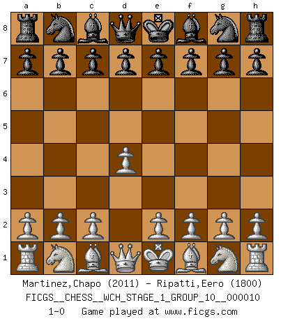 Last move : 1-0 2012 March 14 8:37:19 [Event "FICGS__CHESS__WCH_STAGE_1_GROUP_10__000010"] [Site "FICGS"] [Date "2012.02.12"] [Round "1"] [White "Martinez,Chapo"] [Black "Ripatti,Eero"] [Result "1-0"] [WhiteElo "2011"] [BlackElo "1800"] 1.d4 1-0 This chess game has been lost on time (started : 2012.02.12 21:33:50) Queen's pawn Player White won this chess game. Follow this game move after move (download)A Chess game is a dialogue, a conversation between a player and his opponent. Each move by the opponent may contain threats or be a blunder, but a player cannot defend against threats or take advantage of blunders if he does not first ask himself: What is my opponent planning after each move ? (Bruce A. Moon) Ich habe die besten Aussichten, den ersten Preis zu gewinnen - denn jeder muss gegen Steinitz spielen, nur ich nicht! (Wilhelm Steinitz) Haz el enroque temprano y seguido. (Rob Sillars) Votre prénom est 'Tactique', votre deuxième prénom est 'Tactique' et votre nom est 'Tactique'. (Ken Smith) The message for business people contemplating their place in the cyberspace is simple and direct: get linked or get lost. (Vic Sussman and Kenan Pollack)