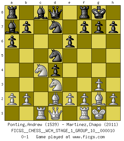 Last move : 0-1 2012 February 20 19:51:5 [Event "FICGS__CHESS__WCH_STAGE_1_GROUP_10__000010"] [Site "FICGS"] [Date "2012.01.01"] [Round "1"] [White "Ponting,Andrew"] [Black "Martinez,Chapo"] [Result "0-1"] [WhiteElo "1539"] [BlackElo "2011"] 1.d4 Nf6 2.c4 e6 3.g3 d5 4.Bg2 dxc4 5.Nf3 a6 6.Ne5 c5 7.Na3 cxd4 8.Naxc4 Bc5 9.O-O O-O 10.Bd2 Nd5 11.Rc1 Nd7 12.Nd3 Ba7 0-1 This chess game has been lost on time (started : 2012.01.01 23:21:56) Catalan : Open, 5.Nf3 Kingside Castling by player White (move 9) Kingside Castling by player Black (move 9) Player Black won this chess game. Follow this game move after move (download)Chess opens and enriches your mind. (Saudin Robovic) Ich weiss nicht was Gott gegen mich auf 1.e4 antworten würde. (Robert James Fischer) Bobby es el jugador de Ajedrez mas fino que este país jamás haya producido. Su memoria para las movidas, su brillantez en soñar combinaciones y su feróz determinación por la victoria son algo extraño. (John Collins) Il n'y a plus de joueurs du niveau de Jacob Murray dont la seule quête est le beau jeu, le plaisir de voir les pièces construire quelque chose. Sur 10 idées à la minute, 9 seront sans intérêt, la dernière s'avèrera géniale. (Christian Bauer) History is a gallery of pictures in which there are few originals and many copies. (Alexis de Tocqueville)
