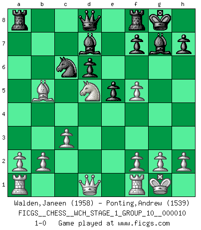 Last move : 1-0 2012 February 26 8:0:52 [Event "FICGS__CHESS__WCH_STAGE_1_GROUP_10__000010"] [Site "FICGS"] [Date "2012.01.01"] [Round "1"] [White "Walden,Janeen"] [Black "Ponting,Andrew"] [Result "1-0"] [WhiteElo "1958"] [BlackElo "1539"] 1.e4 c5 2.Nf3 Nc6 3.d4 cxd4 4.Nxd4 Nf6 5.Nc3 e5 6.Ndb5 d6 7.Bg5 a6 8.Na3 b5 9.Bxf6 gxf6 10.Nd5 f5 11.Bd3 Be6 12.c3 Bg7 13.Nxb5 axb5 14.Bxb5 Bd7 15.exf5 O-O 16.O-O 1-0 This chess game has been lost on time (started : 2012.01.01 23:21:56) Sicilian : Pelikan (Lasker/Sveshnikov) variation Kingside Castling by player Black (move 15) Kingside Castling by player White (move 16) Player White won this chess game. Follow this game move after move (download)Adequate compensation for a sacrifice is having a sound combination leading to a winning position; adequate compensation for a blunder is having your opponent snatch defeat from the jaws of victory. (Bruce A. Moon) Der Umstand, daß uns eine 7 Stunden Zeitkontrolle ermöglicht eine großartige, tiefe Partie zu spielen, ist für die Massenmedien nicht weiter von Bedeutung. (Alexej Shirov) Al jugar al Ajedrez entonces, podemos aprender: Primero: Previsión... Segundo: Prudencia... Tercero: Cautela... Y al final, aprendemos del Ajedrez el hábito de no ser desanimados por apariencias malas presentes en el estado de nuestros asuntos, el hábito de la esperanza por una oportunidad favorable y la perseveración de los secretos de los recursos. (Benjamin Franklin) Le jeu d'échecs est comme rejeté hors du temps. (Antoine de Saint-Exupéry) All war is based on deception. (Sun Tzu)