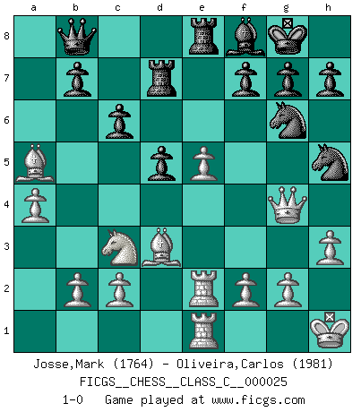 Last move : 1-0 2007 March 30 20:33:28 [Event "FICGS__CHESS__CLASS_C__000025"] [Site "FICGS"] [Date "2007.01.12"] [Round "1"] [White "Josse,Mark"] [Black "Oliveira,Carlos"] [Result "1-0"] [WhiteElo "1764"] [BlackElo "1981"] 1.e4 c6 2.d4 d6 3.Nc3 Qc7 4.Nf3 e5 5.a4 Bg4 6.Be3 Nf6 7.Be2 Be7 8.O-O Nbd7 9.h3 Bxf3 10.Bxf3 O-O 11.Qd2 a5 12.Rad1 Rad8 13.Rfe1 exd4 14.Bxd4 Ne5 15.Be2 Rfe8 16.Qe3 Nfd7 17.Qg3 Nf6 18.Kh1 Ng6 19.Rd2 Qc8 20.Bb6 Rd7 21.Bxa5 Bf8 22.Bd3 d5 23.e5 Qb8 24.Rde2 Nh5 25.Qg4 1-0 Caro-Kann defense Kingside Castling by player White (move 8) Kingside Castling by player Black (move 10) Player White won this chess game. Follow this game move after move (download)Without error there can be no brilliancy. (Emanuel Lasker) Ohne Fehler kann es keine Brillanz geben. (Emanuel Lasker) Aunque la mayoría de la gente disfruta observar las partidas de los grandes Maestros de ataque, algunos de los jugadores mas notables en la historia han sido los jugadores silenciosos posicionales. Lentamente ellos te aplastan despojandote de tu espacio, congestionando tus piezas y dejandote virtualmente sin nada que hacer. (Yasser Seirawan) Mais l'homme est une créature légère et illogique : semblable au joueur d'échecs, il n'aime que le processus du but à atteindre, non le but lui-même. (Dostoïevsky) Big Chess is a place for big hallucinations. (Thibault de Vassal)
