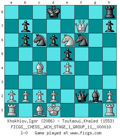 Last move : 1-0 2012 January 28 15:56:21 [Event "FICGS__CHESS__WCH_STAGE_1_GROUP_11__000010"] [Site "FICGS"] [Date "2012.01.01"] [Round "1"] [White "Khokhlov,Igor"] [Black "Toutaoui,Khaled"] [Result "1-0"] [WhiteElo "2086"] [BlackElo "1553"] 1.e4 e5 2.Nc3 Nc6 3.Bc4 Bc5 4.Qg4 Qf6 5.Nd5 Qxf2+ 6.Kd1 Bb6 7.Qxg7 d6 8.Nf3 Bh3 9.Nxc7+ Kd8 10.Nxa8 Bxg2 11.Qf8+ Kd7 12.Nxb6+ axb6 13.Qxf7+ Kd8 14.Ng5 Nf6 15.Ne6+ 1-0 Vienna game, Max Lange defense Player White won this chess game. Follow this game move after move (download)All my games are real. (Bobby Fischer) Die Leute spielen gegen mich seit 15 Jahren unter Ihren Möglichkeiten. (Robert James Fischer) Creo que una cierta cantidad de temperamento es esperada de los genios del Ajedrez. (Ron Gross) Les échecs, c'est l'imagination. (David Bronstein) If computers get too powerful, we can organize them into committees. That'll do them in. (Anonymous)