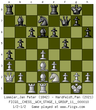 Last move : 1/2-1/2 2012 March 27 0:20:2 [Event "FICGS__CHESS__WCH_STAGE_1_GROUP_11__000010"] [Site "FICGS"] [Date "2012.01.01"] [Round "1"] [White "Lommler,Jan Peter"] [Black "Hardfeldt,Pan"] [Result "1/2-1/2"] [WhiteElo "1842"] [BlackElo "2021"] 1.Nf3 Nf6 2.c4 c6 3.d4 d5 4.e3 e6 5.Nc3 Nbd7 6.Qc2 Bd6 7.Bd3 O-O 8.O-O dxc4 9.Bxc4 a6 10.Rd1 b5 11.Bd3 Bb7 12.Ng5 h6 13.Nge4 Bc7 14.a3 a5 15.Bd2 Nxe4 16.Nxe4 f5 17.Ng3 Qe7 18.Qb3 a4 19.Qa2 Qf7 20.Rac1 Bd6 21.Ne2 Rfe8 1/2-1/2 Reti Opening Kingside Castling by player Black (move 7) Kingside Castling by player White (move 8) This chess game ended in a draw. Follow this game move after move (download)Chess is ruthless: you've got to be prepared to kill people. (Nigel Short) Frage des Reporters: -Welche besonderen Umstände rechtfertigen das Anhalten der Uhren während einer Turnierpartie? Antwort: -Einen Fotographen zu strangulieren. (Siegbert Tarrasch) La captura del Rey enemigo es la finalidad pero no el primer objetivo de la partida. (William Steinitz) Vous savez, camarade Pachman, je n'éprouve pas de plaisir à être ministre, je jouerais plutôt aux échecs comme vous, ou alors ferais une révolution au Venezuela. (Che Guevara à Ludek Pachman, 'Checkmate in Prague', 1975) I teach you to lie, cheat and steal, and as soon as my back's turned you wait in line ? (Gregory House, House M.D.)
