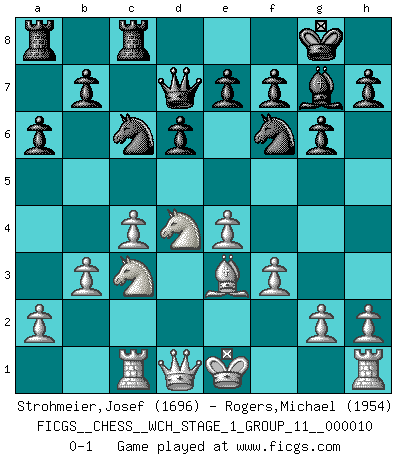 Last move : 0-1 2012 February 5 17:55:53 [Event "FICGS__CHESS__WCH_STAGE_1_GROUP_11__000010"] [Site "FICGS"] [Date "2012.01.01"] [Round "1"] [White "Strohmeier,Josef"] [Black "Rogers,Michael"] [Result "0-1"] [WhiteElo "1696"] [BlackElo "1954"] 1.e4 c5 2.Nf3 d6 3.Bb5+ Bd7 4.Bxd7+ Qxd7 5.c4 Nf6 6.Nc3 g6 7.d4 cxd4 8.Nxd4 Bg7 9.f3 O-O 10.Be3 Rc8 11.b3 a6 12.Rc1 Nc6 0-1 Sicilian : Canal-Sokolsky attack, Sokolsky variation Kingside Castling by player Black (move 9) Player Black won this chess game. Follow this game move after move (download)Before the endgame, the Gods have placed the middle game. (Siegbert Tarrasch) Die jungen Leute sollen verstehen, dass sie noch etwas von mir lernen können und müssen. (Viktor Kortschnoi) El jugador de combinación piensa hacia adelante; comienza de la posición dada y trabaja las movidas contundentes en su mente. (Emanuel Lasker) Le jeu d'échecs est comme rejeté hors du temps. (Antoine de Saint-Exupéry) Now the reason the enlightened prince and the wise general conquer the enemy whenever they move and their achievements surpass those of ordinary men is foreknowledge. (Sun Tzu)