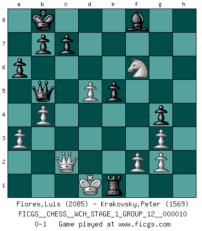 Last move : 0-1 2012 April 5 23:21:1 [Event "FICGS__CHESS__WCH_STAGE_1_GROUP_12__000010"] [Site "FICGS"] [Date "2012.01.01"] [Round "1"] [White "Flores,Luis"] [Black "Krakovsky,Peter"] [Result "0-1"] [WhiteElo "2085"] [BlackElo "1569"] 1.d4 d5 2.Bg5 Nc6 3.e3 f6 4.Bh4 Nh6 5.c4 dxc4 6.Bxc4 Nf5 7.Nf3 e5 8.Nc3 exd4 9.exd4 Qe7+ 10.Kf1 Bd7 11.Bg3 Nxg3+ 12.hxg3 O-O-O 13.a3 g5 14.Qd3 Kb8 15.d5 Ne5 16.Nxe5 fxe5 17.Re1 Bg7 18.Rxh7 Rxh7 19.Qxh7 Rh8 20.Qd3 g4 21.Ne4 Bf8 22.Qc3 Bf5 23.Bd3 Rh2 24.Bc2 a6 25.b4 Qd7 26.Nf6 Rh1+ 27.Ke2 Qb5+ 28.Kd1 Bxc2+ 29.Qxc2 Rxe1+ 0-1 This chess game has been lost on time (started : 2012.01.01 23:26:4) Levitsky attack (Queen's Bishop attack) Queenside Castling by player Black (move 12) Player Black won this chess game. Follow this game move after move (download)By this measure (on the gap between Fischer & his contemporaries), I consider him the greatest world champion. (Garry Kasparov) Das Schachspiel ist ein See, in welchem eine Mücke baden und ein Elefant ertrinken kann. (Emanuel Lasker) Me gusta decir que Bobby Fischer fue el mejor jugador que jamás haya existido. Pero lo que hizo de Fischer un genio, fue su habilidad de mezclar una frescura y pragmatismo Americano con ideas Rusas acerca de la estrategia. (Bruce Pandolfini) À la honte des hommes, on sait que les lois du jeu sont les seules qui soient partout justes, claires, inviolables et exécutées. Pourquoi l'Indien qui a donné les règles du jeu d'échecs est-il obéi de bon gré dans toute la terre, et que les décrétales des papes, par exemple, sont aujourd'hui un objet d'horreur et de mépris ? C'est que l'inventeur des échecs combina tout avec justesse pour la satisfaction des joueurs, et que les papes, dans leurs décrétales, n'eurent en vue que leur seul avantage. L'Indien voulut exercer également l'esprit des hommes et leur donner du plaisir; les papes ont voulu abrutir l'esprit des hommes. Voltaire (Dictionnaire philosophique / Garnier 1967) Inventor: A person who makes an ingenious arrangement of wheels, levers and springs, and believes it civilization. (Ambrose Bierce, The Devil's Dictionary)