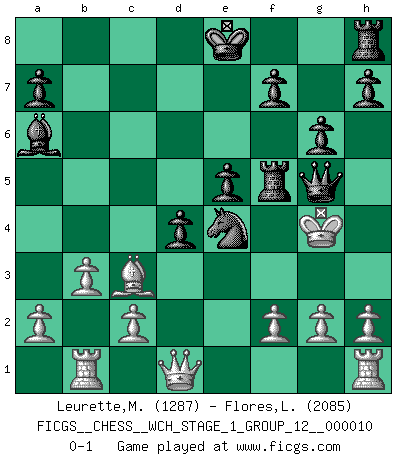 Last move : 0-1 2012 February 24 10:27:34 [Event "FICGS__CHESS__WCH_STAGE_1_GROUP_12__000010"] [Site "FICGS"] [Date "2012.01.01"] [Round "1"] [White "Leurette,Marc-Antoine"] [Black "Flores,Luis"] [Result "0-1"] [WhiteElo "1287"] [BlackElo "2085"] 1.e4 c5 2.Nc3 Nc6 3.Nf3 g6 4.d4 cxd4 5.Nxd4 Bg7 6.Nxc6 bxc6 7.Bd2 Rb8 8.b3 Nf6 9.Bc4 d5 10.exd5 cxd5 11.Bb5+ Nd7 12.Bg5 Bxc3+ 13.Ke2 Rxb5 14.Rb1 Ba6 15.Kf3 d4 16.Bd2 Nf6 17.Bxc3 Rf5+ 18.Kg3 Ne4+ 19.Kh4 e5 20.Kg4 Qg5+ 0-1 Sicilian : Closed, 2...Nc6 Player Black won this chess game. Follow this game move after move (download)During a Chess competition a Chessmaster should be a combination of a beast of prey and a monk. (Alexander Alekhine) Ich bin Weltmeister und muß mit niemandem irgend etwas diskutieren. (Viswanathan Anand) Las ideas audaces son como las piezas del Ajedrez que avanzan hacia adelante. Ellas pueden ser vencidas, pero también pueden iniciar una partida victoriosa. (Goethe) Ce n'est pas pour s'amuser qu'il joue aux échecs : il célèbre un culte. (Vladimir Nabokov) Every now and then a man's mind is stretched by a new idea and never shrinks back to its former dimensions. (Oliver Wendell Holmes, Sr.)