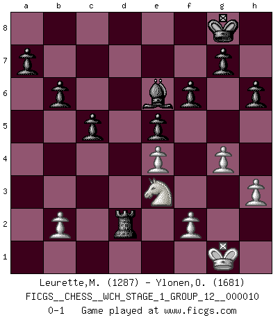 Last move : 0-1 2012 April 1 19:10:51 [Event "FICGS__CHESS__WCH_STAGE_1_GROUP_12__000010"] [Site "FICGS"] [Date "2012.01.01"] [Round "1"] [White "Leurette,Marc-Antoine"] [Black "Ylonen,Olli"] [Result "0-1"] [WhiteElo "1287"] [BlackElo "1681"] 1.e4 e5 2.Nf3 Nc6 3.Bc4 Bc5 4.c3 Nf6 5.Ng5 O-O 6.d3 h6 7.Nf3 d5 8.exd5 Nxd5 9.Bxd5 Qxd5 10.c4 Qd6 11.Nc3 Bf5 12.Nd5 Nb4 13.O-O Nxd5 14.cxd5 Qxd5 15.Re1 f6 16.Be3 Bxe3 17.Rxe3 Rad8 18.Rc1 Qxa2 19.Qd2 Rf7 20.Ne1 b6 21.h3 c5 22.g4 Be6 23.Re2 Qa4 24.Re4 Qxe4 25.dxe4 Rxd2 26.Rc2 Rxc2 27.Nxc2 Rd7 28.Ne3 Rd2 0-1 Giuoco Piano Kingside Castling by player Black (move 5) Kingside Castling by player White (move 13) Player Black won this chess game. Follow this game move after move (download)Do you realize Fischer almost never has any bad pieces? He exchanges them, and the bad pieces remain with his opponents. (Yuri Balashov) Das Schach ist nichts für kleine Geister, es beansprucht einen vollen Mann, der sich nicht sklavisch an das Überlieferte hält, sondern selbständig die Tiefen des Spiels zu ergründen sucht. (Wilhelm Steinitz) La batalla por la última verdad nunca sera ganada. Y es por eso que el Ajedrez es tan fascinante. (Hans Kmoch) Même un GMI sait rarement calculer sur plus de cinq coups une attaque à sacrifices. (Rudolf Spielmann) Luck has a peculiar habit of favoring those who don't depend on it. (Author unknown)