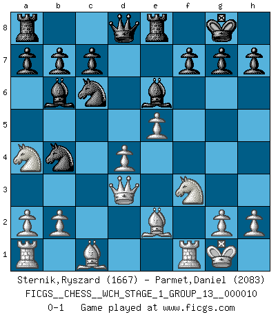 Last move : 0-1 2012 January 21 10:23:21 [Event "FICGS__CHESS__WCH_STAGE_1_GROUP_13__000010"] [Site "FICGS"] [Date "2012.01.01"] [Round "1"] [White "Sternik,Ryszard"] [Black "Parmet,Daniel"] [Result "0-1"] [WhiteElo "1667"] [BlackElo "2083"] 1.e4 e5 2.f4 Bc5 3.Nf3 d6 4.c3 Nf6 5.d4 exd4 6.cxd4 Bb6 7.Nc3 O-O 8.e5 Re8 9.Be2 dxe5 10.fxe5 Nd5 11.O-O Nc6 12.Na4 Be6 13.Qd3 Ndb4 0-1 KGD : Classical, 4.c3 Kingside Castling by player Black (move 7) Kingside Castling by player White (move 11) Player Black won this chess game. Follow this game move after move (download)All I want to do, ever, is just play Chess. (Bobby Fischer) Fischer ist das größte Genie, das je vom Schachhimmel heruntergestiegen ist. (Mikhail Nekhemyevich Tal) El Peón aislado arroja penumbra sobre todo el tablero. (Aaron Nimzovich) En blitz, le Cavalier l'emporte sur le Fou. (Vlastimil Hort) A clear conscience is usually the sign of a bad memory. (Unknown)
