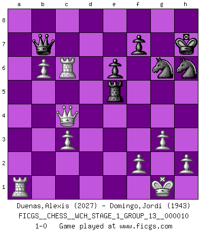 Last move : 1-0 2012 March 27 18:21:5 [Event "FICGS__CHESS__WCH_STAGE_1_GROUP_13__000010"] [Site "FICGS"] [Date "2012.01.01"] [Round "1"] [White "Duenas,Alexis"] [Black "Domingo,Jordi"] [Result "1-0"] [WhiteElo "2027"] [BlackElo "1943"] 1.d4 h6 2.e4 a6 3.Nc3 e6 4.Nf3 b5 5.Bd3 c5 6.e5 cxd4 7.Nxd4 Bb7 8.O-O Ne7 9.a4 Nec6 10.Nf3 bxa4 11.Qe2 Qc7 12.Rd1 Nb4 13.Be4 Bxe4 14.Qxe4 N8c6 15.Ne2 a5 16.Rxa4 Rd8 17.c3 Nd5 18.Ng3 Nb6 19.Ra1 d5 20.exd6 Bxd6 21.Be3 O-O 22.Nh5 Kh8 23.Nf6 gxf6 24.Qh4 Kg8 25.Bxh6 Ne7 26.Qxf6 Nf5 27.Qg5+ Kh7 28.Bxf8 Rxf8 29.Rxa5 Be7 30.Qh5+ Nh6 31.Ng5+ Bxg5 32.Rxg5 Nd5 33.g3 Ne7 34.Rc5 Qb7 35.b4 Nef5 36.Qe2 Rb8 37.Ra1 Rg8 38.b5 Rg5 39.Rc6 Ne7 40.Qe4+ Ng6 41.b6 Re5 42.Qc4 1-0 Queen's pawn Kingside Castling by player White (move 8) Kingside Castling by player Black (move 21) Player White won this chess game. Follow this game move after move (download)For me, Chess is life and every game is like a new life. Every Chess player gets to live many lives in one lifetime. (Eduard Gufeld) Der Verteidiger gebe der Gewalt nach, aber nur der Gewalt. Er schaffe sich nicht freiwillig, etwa aus Blindheit oder aus Schrecken, irgendwelche Schwächen. Er lasse sich nicht bluffen. (Emanuel Lasker) El juego del Ajedrez no es solamente una diversión quieta; algunas cualidades muy valuables de la mente se pueden adquirir y cultivar con el, como convertirlos en habitos disponibles para toda ocasión; ya que la vida es algo así como el Ajedrez. (Benjamin Franklin) C'est une question de caractère, Beaucoup de gens perdent leur motivation très vite. D'autres, ils sont rares, peuvent la conserver très longtemps. J'aime les échecs, encore aujourd'hui je suis heureux d'analyser des parties. J'aime toujours gagner, je déteste encore perdre. Bien jouer est important pour mon intégrité intellectuelle et morale. Et puis les échecs vivent en ce moment une période historique grâce à Internet. Ils se développent dans les systèmes éducatifs à travers le monde. Ils sortent de leur ghetto, et c'est mon rôle de mener à bien cette révolution. (Gary Kasparov) It's unlucky to be superstitious. (Dave Enteles)