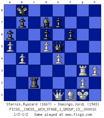Last move : 1/2-1/2 2012 March 10 11:39:42 [Event "FICGS__CHESS__WCH_STAGE_1_GROUP_13__000010"] [Site "FICGS"] [Date "2012.01.01"] [Round "1"] [White "Sternik,Ryszard"] [Black "Domingo,Jordi"] [Result "1/2-1/2"] [WhiteElo "1667"] [BlackElo "1943"] 1.e4 h6 2.d4 c5 3.d5 d6 4.Bd3 a6 5.Nf3 Nd7 6.O-O g5 7.a4 g4 8.Nfd2 Ne5 9.Nc4 Nxc4 10.Bxc4 Bg7 11.Nc3 Be5 12.a5 Nf6 13.Qd3 h5 14.Ne2 h4 15.c3 Qc7 16.Bf4 Bxf4 17.Nxf4 Nd7 18.b3 Ne5 19.Qe2 Rg8 20.Nd3 Nxd3 21.Bxd3 g3 22.h3 Bd7 23.Qh5 O-O-O 24.Qxh4 gxf2+ 25.Rxf2 f6 26.Rf3 Rh8 27.Qf2 Kb8 28.Rg3 Qc8 29.Re1 Rdg8 30.R1e3 Qc7 31.b4 cxb4 32.cxb4 Qc1+ 33.Kh2 Qa1 34.Rxg8+ Rxg8 35.Bf1 Qd4 36.Qe1 Rc8 37.Rb3 Qe5+ 38.Kg1 Rc2 39.Rg3 1/2-1/2 Carr's defense Kingside Castling by player White (move 6) Queenside Castling by player Black (move 23) This chess game ended in a draw. Follow this game move after move (download)It began to feel as though you were playing against Chess itself. - On playing against Robert Fischer. (Walter Shipman) Das Zentrum ist der Balkan des Schachbretts - Kriegshandlungen können in jedem Moment ausbrechen. (Aaron Nimzowitsch) No hay precio que sea tan grande por la cabellera del Rey enemigo. (Koblentz) Le moment que je préfère le plus dans une rencontre, c'est celui où je sens que la personnalité de l'adversaire se brise. (Robert Fischer) Just because you do not take an interest in politics doesn't mean politics won't take an interest in you. (Pericles 430 B.C.)
