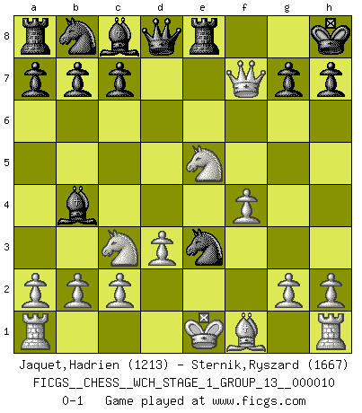 Last move : 0-1 2012 February 16 19:46:31 [Event "FICGS__CHESS__WCH_STAGE_1_GROUP_13__000010"] [Site "FICGS"] [Date "2012.01.01"] [Round "1"] [White "Jaquet,Hadrien"] [Black "Sternik,Ryszard"] [Result "0-1"] [WhiteElo "1213"] [BlackElo "1667"] 1.e4 e5 2.f4 d5 3.exd5 e4 4.d3 Nf6 5.Nc3 Bb4 6.Bd2 e3 7.Bxe3 O-O 8.Nf3 Re8 9.Ne5 Nxd5 10.Qh5 Nxe3 11.Qxf7+ Kh8 0-1 This chess game has been lost on time (started : 2012.01.01 23:28:32) KGD : Falkbeer, Morphy gambit Kingside Castling by player Black (move 7) Player Black won this chess game. Follow this game move after move (download)Chess is not like life... it has rules ! (Mark Pasternak) Man wirke der falschen Auffassung entgegen, als ob jeder Zug Unmittelbares zu leisten habe; auch Werte- und Ruhezüge haben ihre Existenzberechtigung. (Aaron Nimzowitsch) En el Ajedrez, cuando menos, el valiente hereda la tierra. (Edmar Mednis) Psychologiquement, tu dois avoir confiance en toi même, mais cette confiance doit être basée sur des faits. (Robert Fischer) A bird doesn't sing because it has an answer, it sings because it has a song. (Maya Angelou)