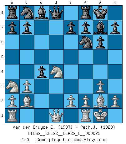 Last move : 1-0 2007 February 14 23:25:51 [Event "FICGS__CHESS__CLASS_C__000025"] [Site "FICGS"] [Date "2007.01.12"] [Round "1"] [White "Van den Cruyce,Els"] [Black "Pech,Jaroslav"] [Result "1-0"] [WhiteElo "1937"] [BlackElo "1929"] 1.d4 Nf6 2.Nf3 g6 3.g3 Bg7 4.Bg2 O-O 5.O-O d6 6.b3 c5 7.Bb2 cxd4 8.Nxd4 d5 9.c4 dxc4 10.Na3 1-0 King's Indian : Fianchetto without c4 Kingside Castling by player Black (move 4) Kingside Castling by player White (move 5) Player White won this chess game. Follow this game move after move (download)I won't play with you anymore. You have insulted my friend. - When an opponent cursed himself for a blunder. (Miguel Najdorf) Ja, ich habe einmal eine Blitzpartie gespielt, es war in einem Zug, 1929. --im Interview 1989 (Mikhail Moiseyevich Botvinik) El Ajedrez te enseña a controlarl la excitación inicial que sientes cuando vez algo que parece bueno y te enseña a pensar objetivamente cuando te encuentras en problemas. (Stanley Kubrick) Que feriez-vous si vous étiez en train de jouer aux échecs et que la fin du monde arrive ? Je continuerais à jouer. (Saint Borromée) The production of too many useful things results in too many useless people. (Karl Marx)