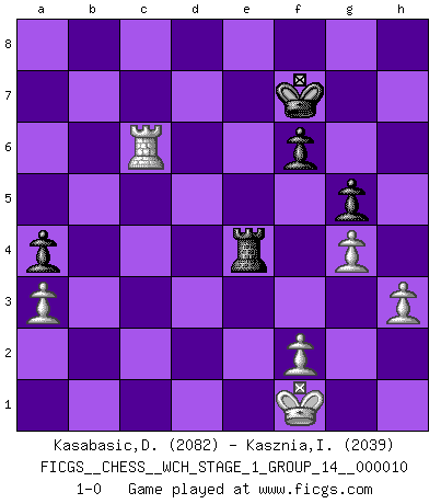 Last move : 1-0 2012 May 19 1:36:10 [Event "FICGS__CHESS__WCH_STAGE_1_GROUP_14__000010"] [Site "FICGS"] [Date "2012.01.01"] [Round "1"] [White "Kasabasic,Djordje"] [Black "Kasznia,Ireneusz"] [Result "1-0"] [WhiteElo "2082"] [BlackElo "2039"] 1.e4 e6 2.d4 d5 3.Nc3 dxe4 4.Nxe4 Nf6 5.Nxf6+ Qxf6 6.Nf3 h6 7.Bd3 Bd6 8.O-O Nc6 9.c3 O-O 10.Nd2 e5 11.Ne4 Qe7 12.dxe5 Nxe5 13.Nxd6 Qxd6 14.Bc2 Qf6 15.Qd5 Rd8 16.Qe4 Ng6 17.Be3 Be6 18.Qxb7 Rab8 19.Qxc7 Rdc8 20.Qd6 Rxb2 21.Be4 Nh4 22.Rfe1 a5 23.Bd4 Qg5 24.Qg3 a4 25.c4 Rb4 26.Qxg5 hxg5 27.Bd3 Rb7 28.Be3 Bxc4 29.Rac1 Rbc7 30.Bxc4 Rxc4 31.Bxg5 f6 32.Rxc4 Rxc4 33.Rc1 Rg4 34.Bxh4 Rxh4 35.Rc8+ Kh7 36.Ra8 g5 37.g3 Rc4 38.h3 Kg6 39.Kf1 Re4 40.Ra6 Kf5 41.a3 Kg6 42.Rc6 Kf7 43.g4 1-0 This chess game has been lost on time (started : 2012.01.01 23:30:7) French : Rubinstein variation Kingside Castling by player White (move 8) Kingside Castling by player Black (move 9) Player White won this chess game. Follow this game move after move (download)Chess is a more highly symbolic game, but the aggressions are therefore even more frankly represented in the play. It probably began as a war game; that is, the representation of a miniature battle between the forces of two kingdoms. (Karl Meninger) Ja, jede Frau in Holland liebt mich bestimmt, und alle Männer hassen mich. (Loek van Wely) El juego del Ajedrez no es solamente una diversión quieta; algunas cualidades muy valuables de la mente se pueden adquirir y cultivar con el, como convertirlos en habitos disponibles para toda ocasión; ya que la vida es algo así como el Ajedrez. (Benjamin Franklin) La vérité est comme le meilleur coup aux échecs : elle existe, mais il faut la chercher. (Arturo Perez-Reverte) When you've done things right people won't know you've done anything at all. (Futurama)