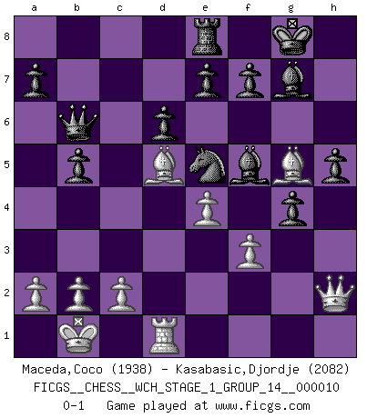 Last move : 0-1 2012 March 16 8:53:15 [Event "FICGS__CHESS__WCH_STAGE_1_GROUP_14__000010"] [Site "FICGS"] [Date "2012.01.01"] [Round "1"] [White "Maceda,Coco"] [Black "Kasabasic,Djordje"] [Result "0-1"] [WhiteElo "1938"] [BlackElo "2082"] 1.e4 c5 2.Nf3 d6 3.d4 cxd4 4.Nxd4 Nf6 5.Nc3 g6 6.Be3 Bg7 7.f3 O-O 8.Qd2 Nc6 9.Bc4 Bd7 10.O-O-O Rc8 11.Bb3 Ne5 12.h4 h5 13.Bg5 Rc5 14.Kb1 b5 15.g4 hxg4 16.h5 Nxh5 17.Nd5 Re8 18.Rxh5 gxh5 19.Qh2 Rxd5 20.Bxd5 Qb6 21.Nf5 Bxf5 0-1 This chess game has been lost on time (started : 2012.01.01 23:30:7) Sicilian : Dragon, Yugoslav attack, 7...O-O Kingside Castling by player Black (move 7) Queenside Castling by player White (move 10) Player Black won this chess game. Follow this game move after move (download)All my games are real. (Bobby Fischer) Darum geht es im Schach. Einen Tag gibst du deinem Gegner eine Lektion, am nächsten Tag gibt er dir eine. (Robert James Fischer) Con o sin el título, Bobby Fischer fue sin lugar a dudas el mas grande jugador de su época. (Burt Hochberg) A chaque perte on perd un peu de soi. (Joël Lautier) If you have any trouble condescending, find a Unix user to show you how it's done. (Scott Adams)